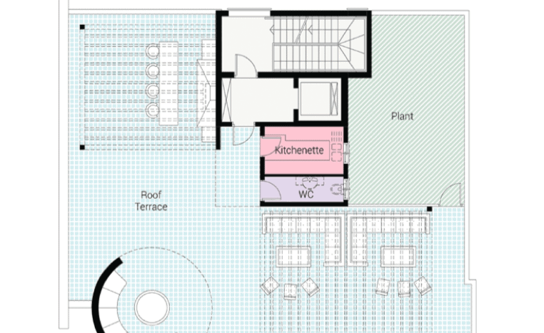 The top floor office also benefits from its private 210sqm roof garden offering breathtaking views of the city with enclosed kitchen and WC facilities, built in bar and ample dining and sitting areas.