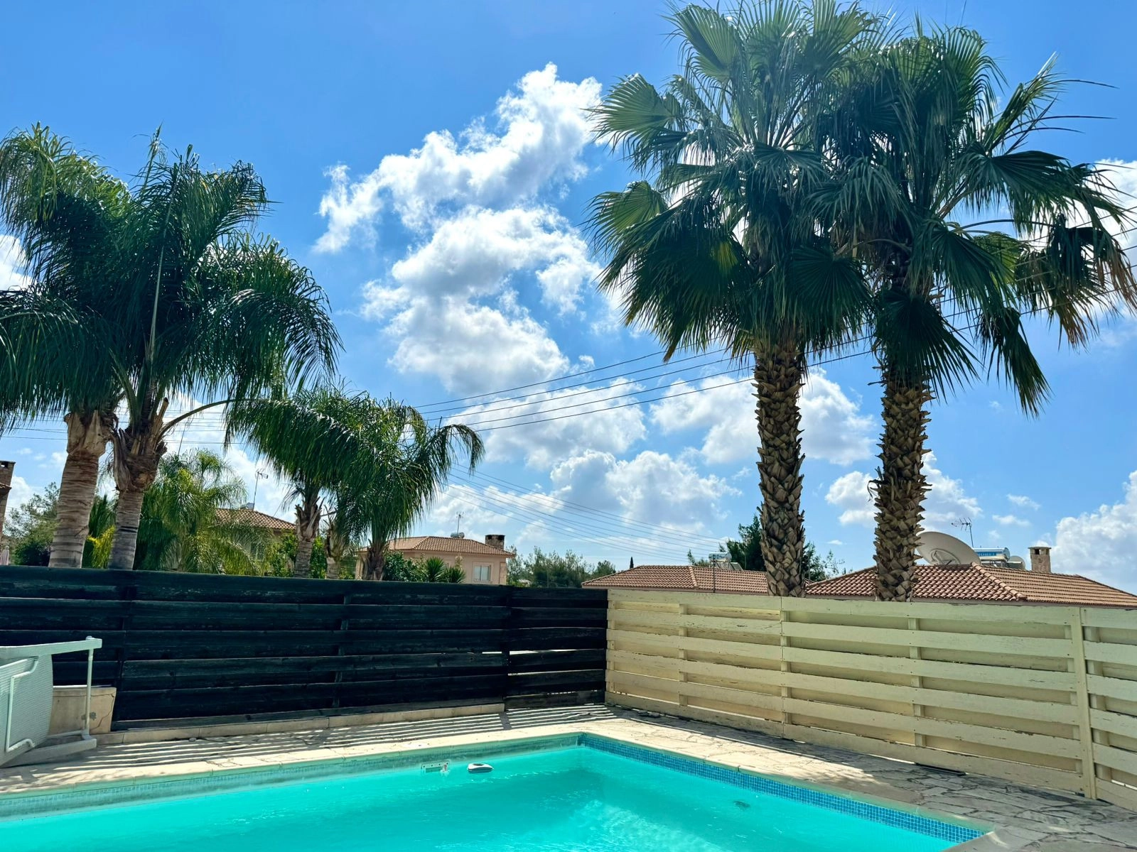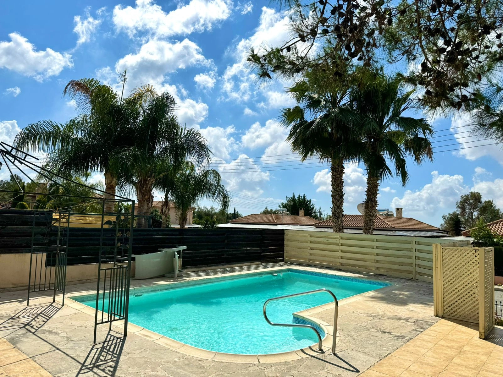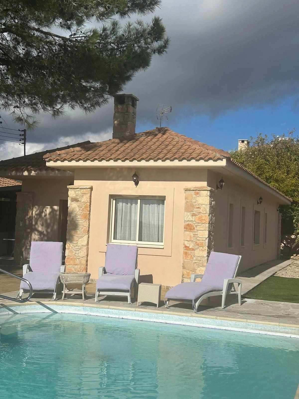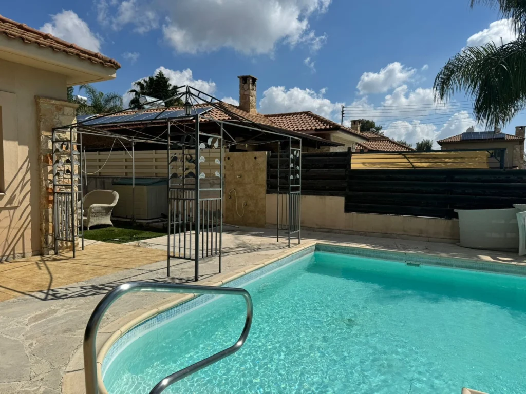 For sale a 3 bedroom bungalow with a swimming pool in the Souni area. There are necessary household appliances and furniture. The house has a garden with tangerine, orange, pomegranate and lime trees. There is also covered parking, outdoor parking and storage rooms.