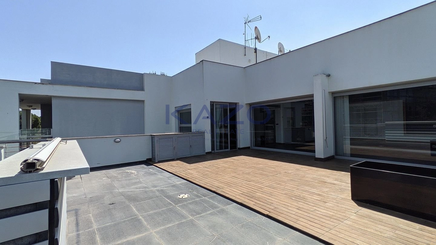Top-floor three bedroom apartment on a 3 storey building, in Engomi, Nicosia. The apartment comprises of an open plan area with entrance/ living room/dining room area, a guest toilet, kitchen with sitting room, three bedrooms, (master bedroom with an en suite bathroom) and a family bathroom. Furthermore it offers a covered terrace and a big uncovered terrace/patio with a bar of approximately 91 sq.m. It is located approximately 750m from B9 motorway, approximately 1km from Agios Dometios community centre and approximately 3km from Engomi community center. The property falls within Zone Κα4, with a building coefficient of 120%, coverage of 50%, and permission for 3 floors (13.5m) of construction. There is a separate title deed for this property. Energy Category: E