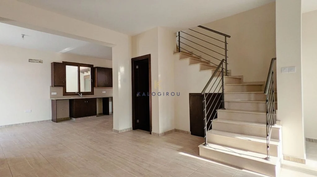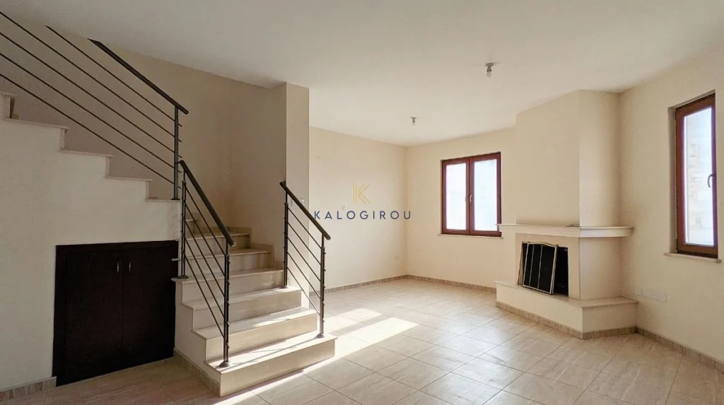 Double Storey House for Sale in Pervolia area. The ground floor consists of a living room with a fireplace, a guest toilet, a kitchen with a dining area and a staircase leading to the first floor.