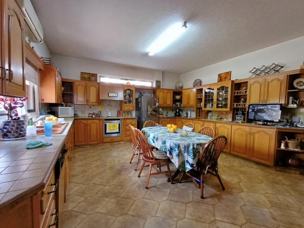 House for sale in Larnaca, Drosia Area. The ground floor includes an open plan living and dining area, guest toilet, a big office room with toilet, 2nd living room with fire place, separate kitchen with a big food storage, To the mezzanine level there is a laundry room and a huge uncovered veranda. The first floor consists of 4 bedrooms, a bathroom, small sitting area, an en-suite shower to the master bedroom and a covered veranda. To the outside area there is a big covered veranda with a BBQ area, a nice garden area and a big double garage around 75 sq. meters with an extra storage unit.
