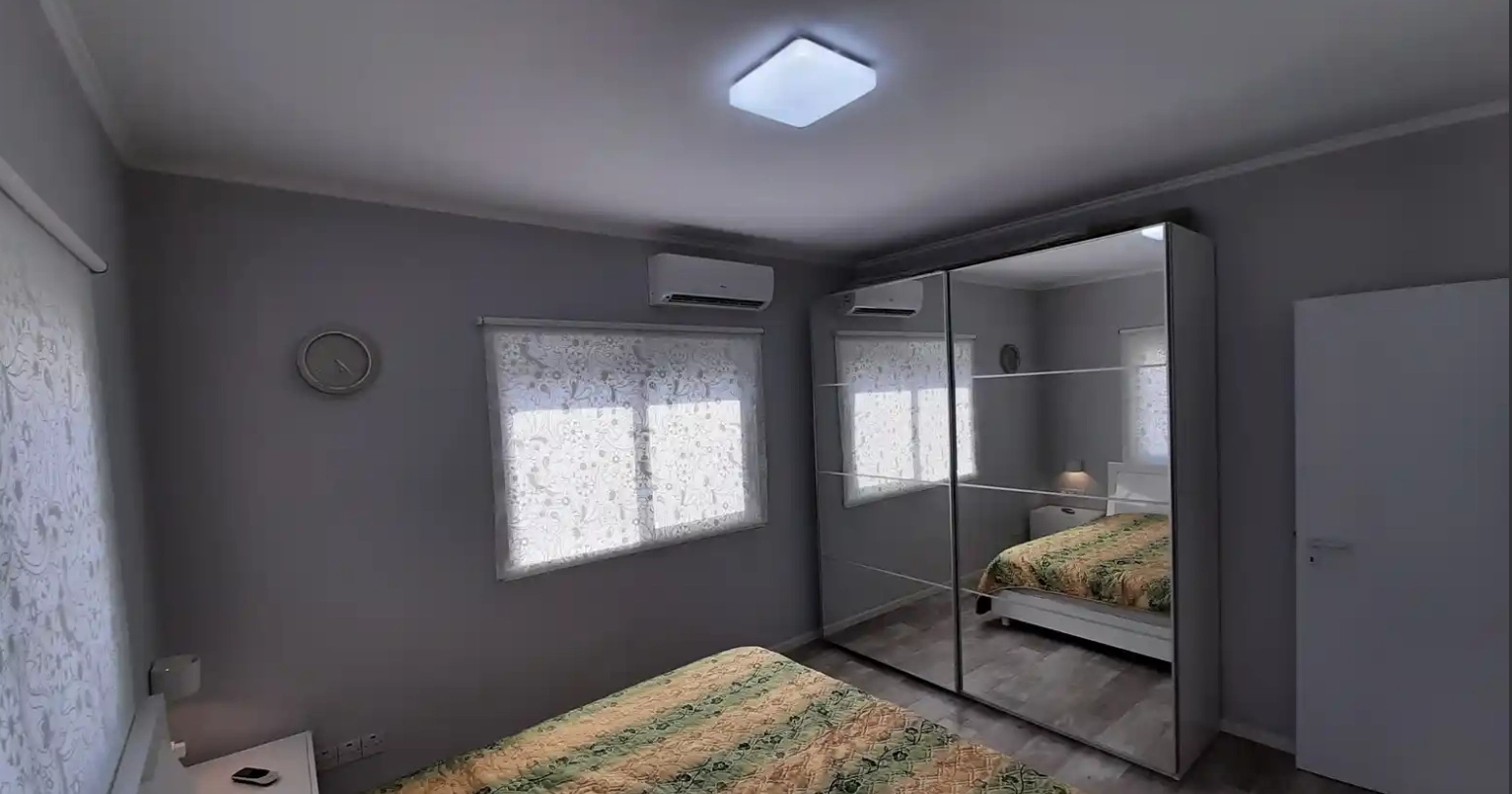 The recently renovated apartment is a well-maintained residence, being 15 years under the private and same person ownership (never rented). It is on the 5th (top) floor with only one adjacent wall to neighbors. It consists of spacious living room, 2 bedrooms, 1 bathroom, 1 partial bathroom, separate kitchen and two balconies. Total area is 91 sq.m, including two balconies of 3 and 8 sq m respectively. It is fully furnished including all kitchen appliances (modern induction hob), electric window blinds in the master bedroom, heated floors in the kitchen and bathroom. The apartment is equipped with a filtered and pressurized water supply system including roof solar panels. There are sea and mountain views available. The flat is ready to move in for immediate living.