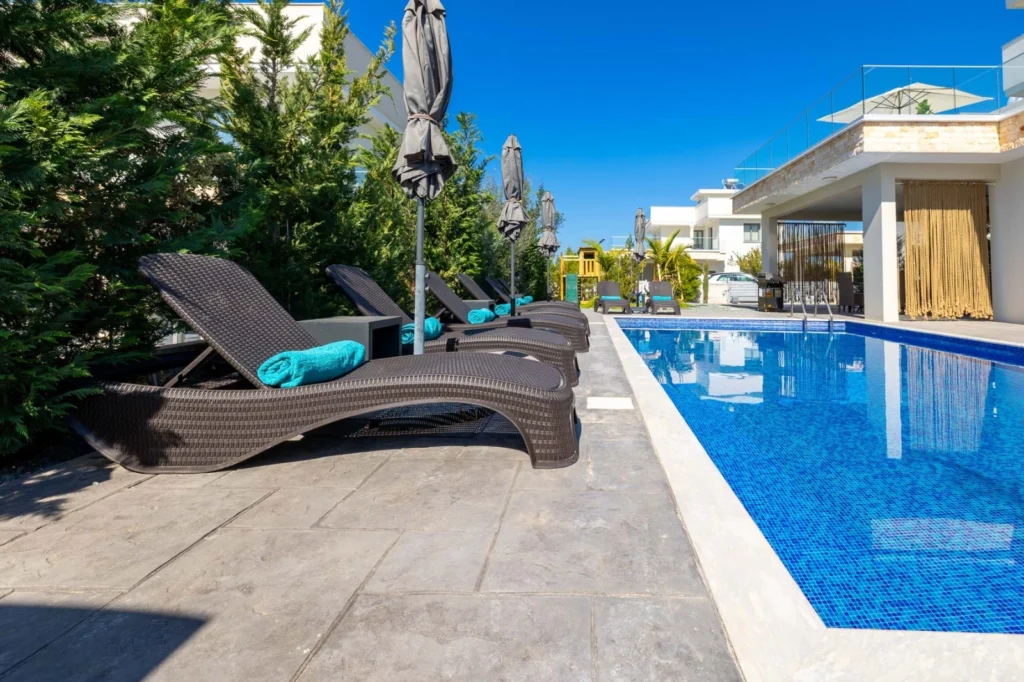 This magnificent brand new sea view villa is located in the exclusive St George area of Peyia, Paphos. St George has a fantastic coastal location, with stunning views of the Mediterranean Sea all around. Just a short drive away from the blue flag Coral Bay beach, the picturesque Sea Caves, and the Akamas Peninsula. All amenities are also close by, including bars, restaurants, shops, a medical center, and an international school. Situated just a short drive away from the beautiful beaches of the Sea Caves region, this 4 bedroom, 4 bathroom newly built villa is an ideal choice for those who dream of a life by the sea. Partially furnished to a very high standard, the villa feels modern and welcoming. Furthermore, air conditioning, underfloor heating, and a photovoltaic panel system for low electricity costs create an energy-efficient and comfortable home environment throughout the year. The ground floor has a well-sized living room with separate dining and kitchen areas. Each of these areas is fully furnished with brand-new items. The kitchen comes complete with all of the expected electrical appliances and has ample worktop and cupboard space. Patio doors lead directly out to the private swimming pool. A bedroom with en-suite shower facilities can also be found on this floor; the room is unfurnished and would make a wonderful playroom or office space. A guest toilet completes this floor. Upstairs there are three en-suite bedrooms, two with a shower and one with a bathtub. Two of these rooms are fully furnished while one is empty, allowing residents to choose how to use this space. A door opens out to a spacious uncovered balcony and from here, stairs lead to the roof terrace where breathtaking views of the Mediterranean Sea can be enjoyed. Outside, a swimming pool takes center stage of a large patio, and there is plenty of space for enjoying the desirable Cyprus climate. To complete the luxurious experience, there is a private sauna and jacuzzi, ideal for relaxation and wellness at home. The property also includes a spacious parking area with room for multiple vehicles. A wonderfully modern home in one of Paphos’ most sought-after locations, offering everything needed for an elevated coastal lifestyle. Distances: Walking distance to the beach and TLC school 2 minutes drive to Cup St George Hotel 7 minutes drive to Coral Bay