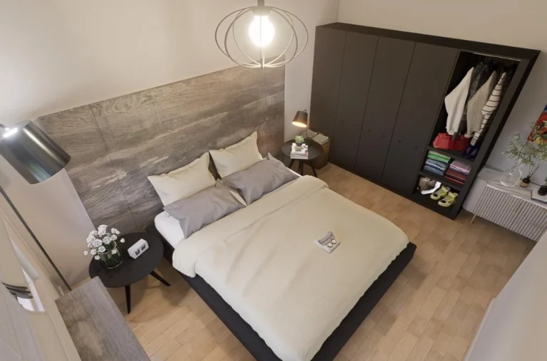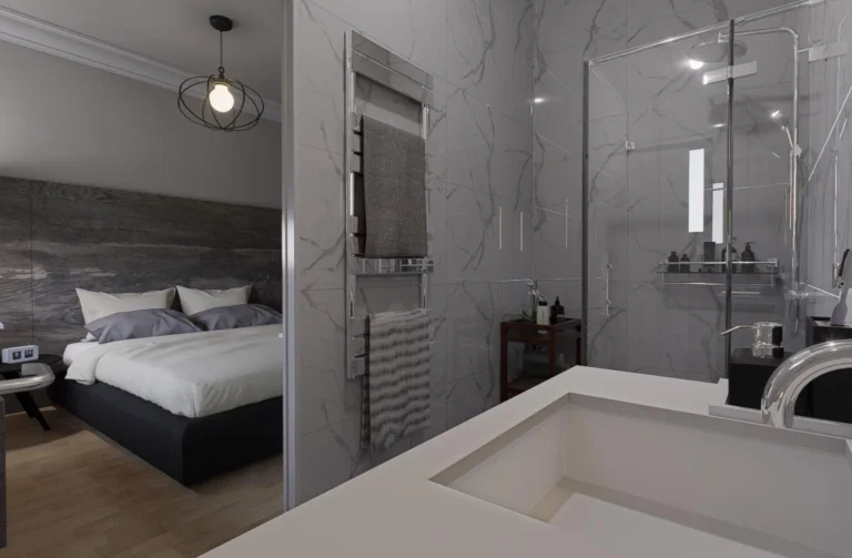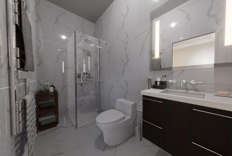 The floor beneath you, crafted from exquisite marble- style ceramic, offers a sense of timeless elegance, while rich wooden accents add a touch of warmth and refinement.