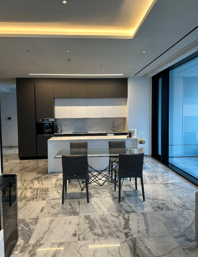 Accessible through private elevator landings, the residences are designed and finished to harmonise with the tower’s architecture and aesthetic. Impeccable quality is apparent throughout each residence in details like oversized core entry doors with designed door hardware and marble floors of the highest quality. Ceilings that are thoughtfully designed with hidden light features complement the character of these lavishly designed residences. The residences also feature energy-saving windows and floor-to-ceiling glass doors, which allow abundant natural light to flood the rooms. Concealed air-conditioning units and a full installation of under-floor heating provide the residences with thermal serenity and comfort. Kitchens are outfitted with European high quality cabinetry and islands with oblique edge details while fully integrated with kitchen appliances of recognised brands. Guest, master and secondary baths offer a dramatic mix of high design and tranquillity with marble floors and marble feature walls, complemented by world-renowned brands of sanitary ware.