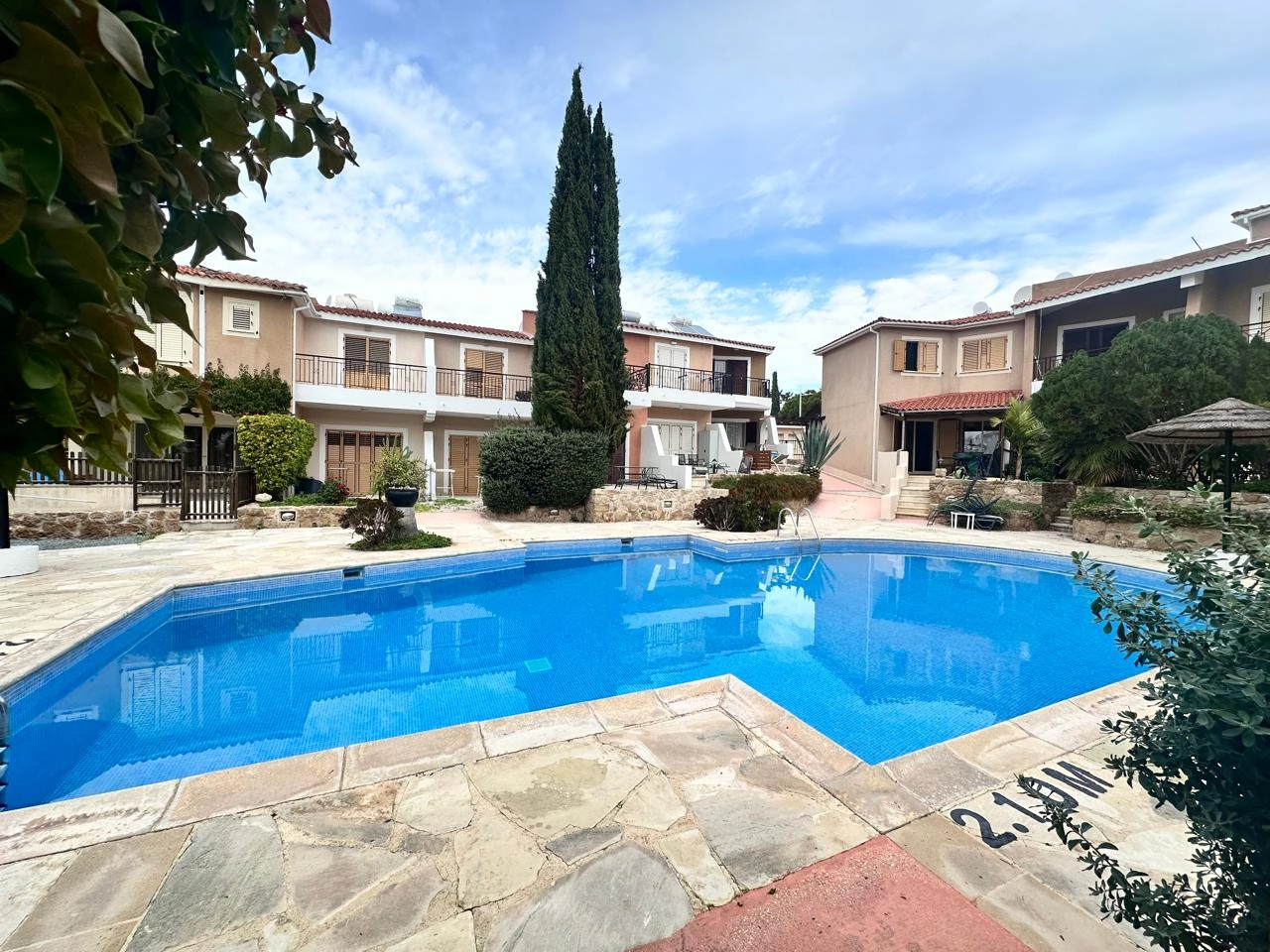 This cosy townhouse is located in Tombs of the Kings area, Paphos. Tombs of the Kings is a vibrant area in Paphos, rich in history and close to the UNESCO-listed archaeological site of ancient tombs. it offers a mix of cultural attractions, modern amenities, and beautiful coastal views, making it a popular destination for both residents and visitors. its central location ensures easy access to shops, restaurants, and the beach. This functional 2-bedroom townhouse offers a practical living space, ideal for those seeking a comfortable and straightforward home. The property is unfurnished, allowing new owners or tenants to personalize it to their taste. On the ground floor, an open-plan living, dining, and kitchen area provides a flexible layout for daily activities. Patio doors open to a private veranda, offering direct access to the communal pool—perfect for relaxing and socializing. A convenient guest toilet is also located on this level. Upstairs, the townhouse features two well-sized bedrooms with fitted wardrobes, ensuring ample storage. Both bedrooms share a centrally located bathroom. Additional amenities include air conditioning and private parking, ensuring comfort and practicality. Residents can enjoy the communal pool and the convenience of this low-maintenance property. ideal for those looking for a simple and affordable living option. Title Deeds Available!