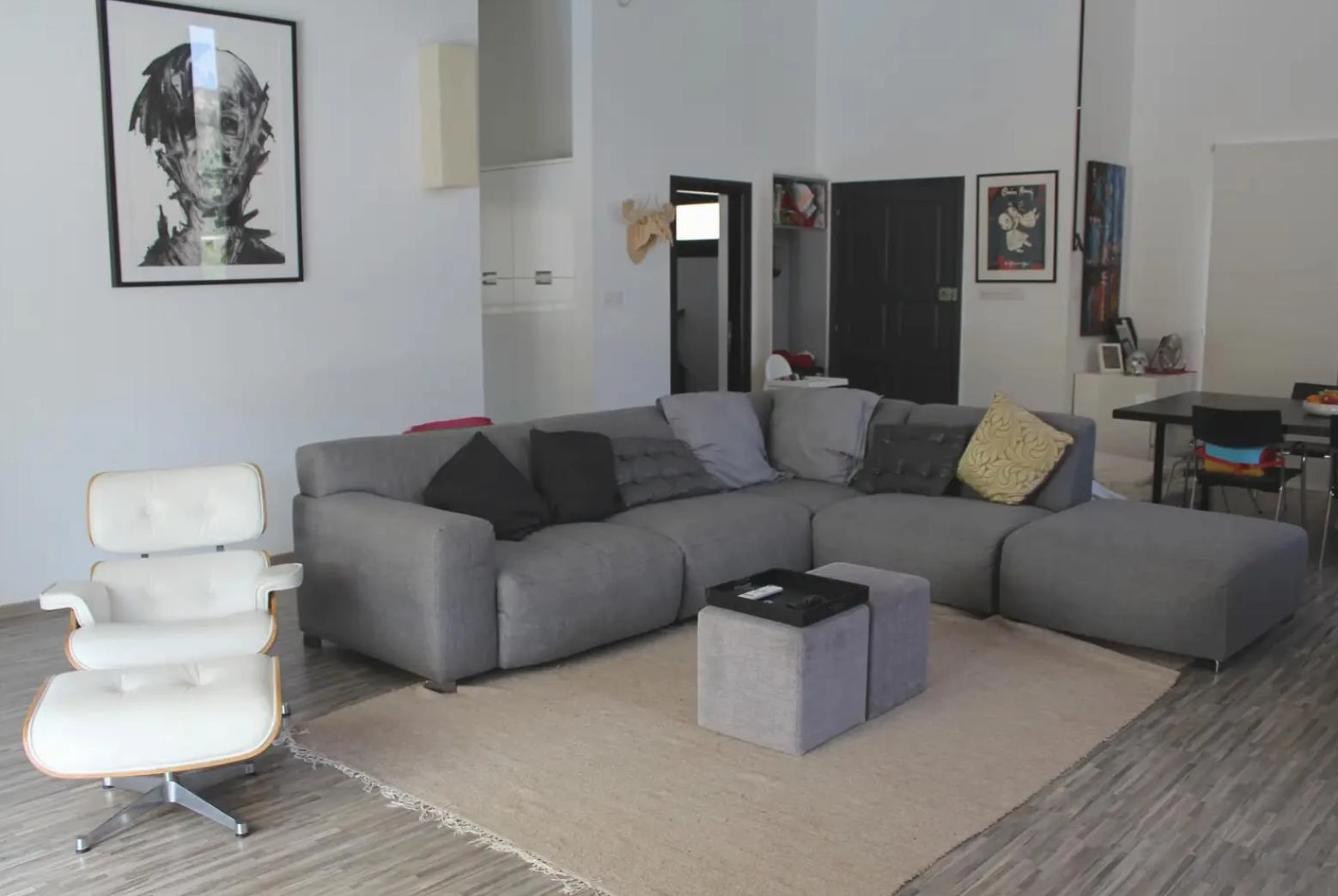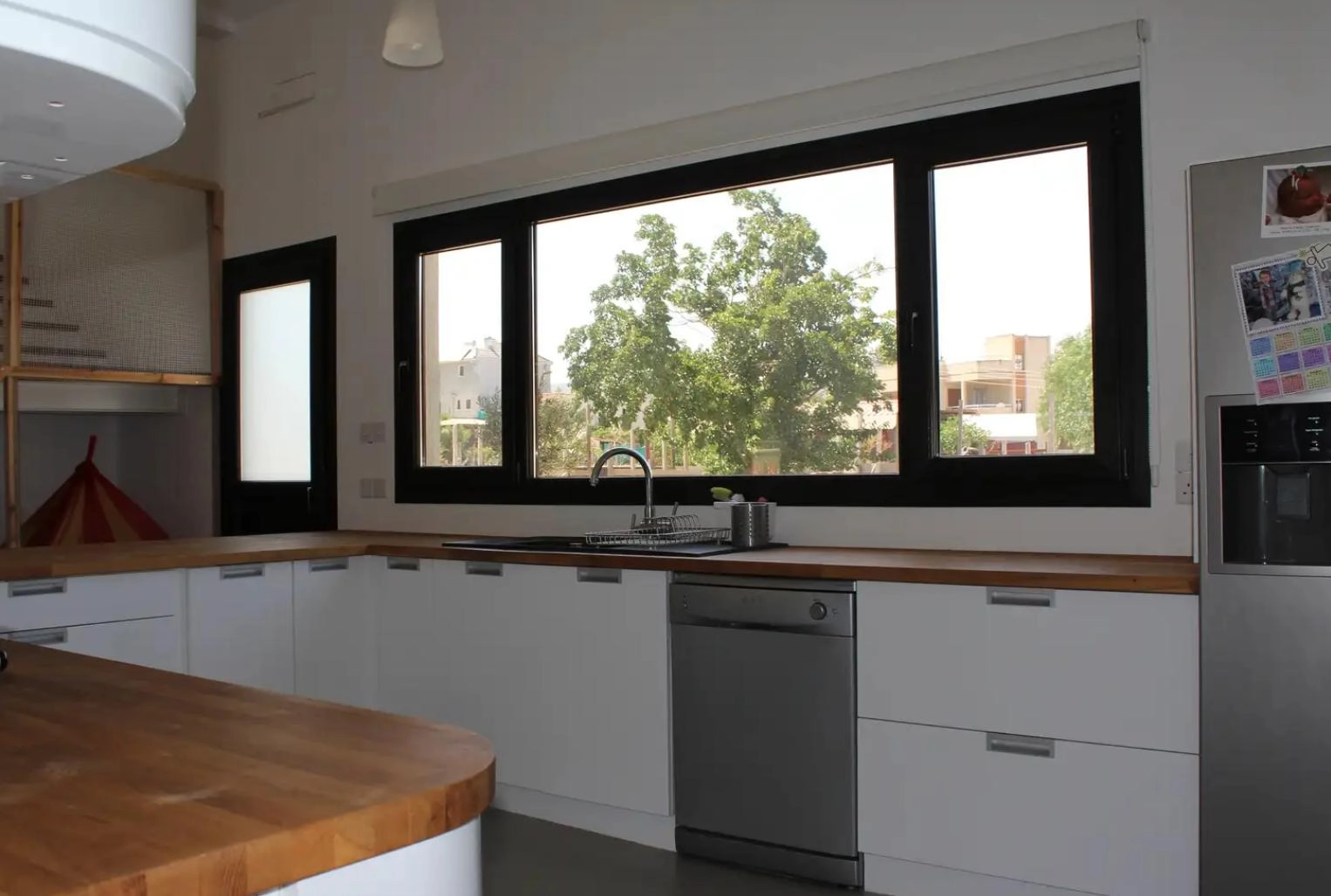 Eco-friendly house for rent in Asgata, Limassol. Modern family house with designer decoration in a quiet village 10 minutes from St. Raphael beach. On the ground floor there is a semi-open plan living room, dining room and kitchen, separate utility room, separate toilet. High ceilings with exposed wooden beams and an open wooden staircase. Traditional stone open fireplace. On the upper floor there are 2 double bedrooms, both with en-suite bathrooms and garden views. All rooms overlook the landscaped garden, which has an 8×4 m swimming pool. Pergolas for year-round shade and a bar area for entertainment. Mature landscape with fruit trees and palm trees, olive and fig trees on the adjacent plot. Available from February 1, 2025.