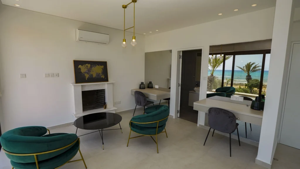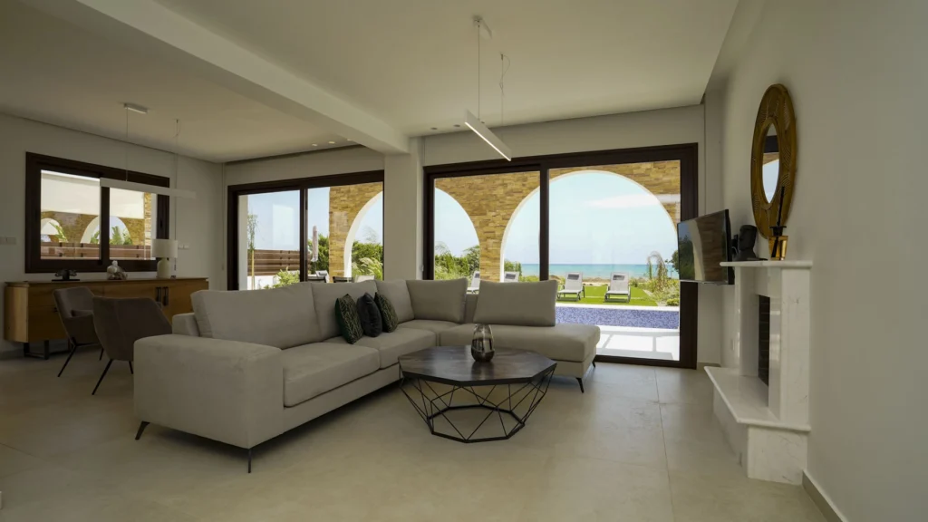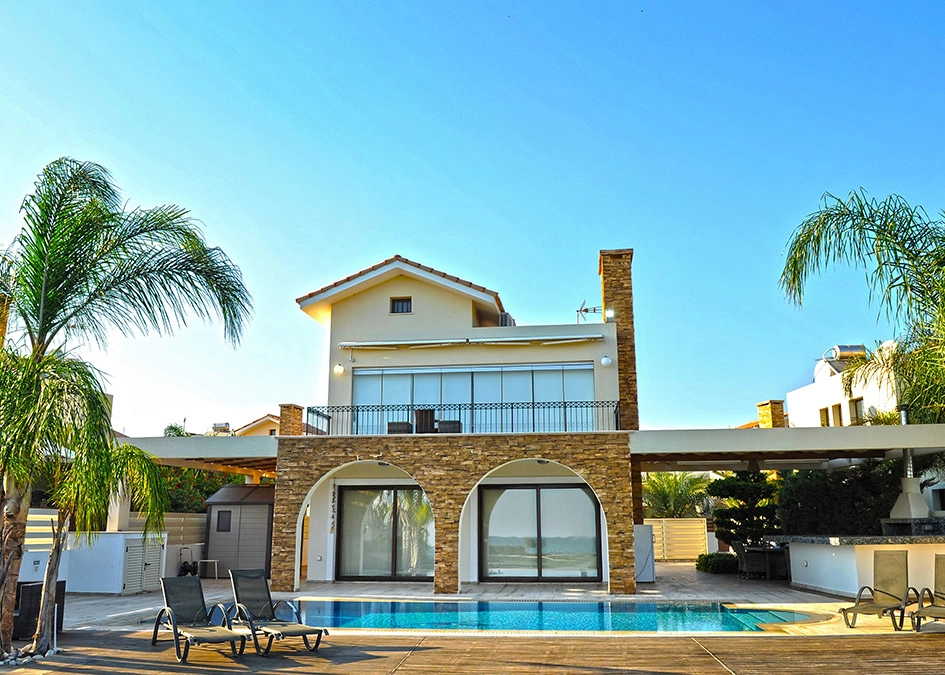 We offer for sale a beautiful villa on the first line, located in a quiet private village on the beach to the west of Agia Napa, has an extensive lush garden and sea views. The villa, thoughtfully designed taking into account traditional architecture and equipped with all modern amenities, has large internal and external living areas, bright bedrooms with sea views, as well as a private pool in the garden and a green area directly to the sea. The villa is sold fully furnished with household appliances.