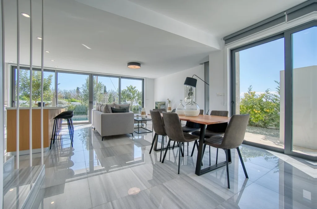 This stunning, modern 4-bedroom villa is located in the picturesque Emba Village, offering a serene and peaceful lifestyle while still being close to the amenities of Paphos. Emba is a charming village known for its traditional Cypriot atmosphere, with beautiful countryside views and a welcoming community. it is just a short drive away from the vibrant town center, local schools, shops, and restaurants, making it an ideal location for both relaxation and convenience. Upon entering the 177 sqm property, you are greeted by an open-plan living, dining, and kitchen area, creating a spacious and bright environment. This area seamlessly flows out to a private garden and a refreshing private swimming pool, perfect for outdoor entertaining or relaxation. On the ground floor, you’ll also find a well-appointed bedroom and a guest toilet with a shower. The first floor features three beautifully designed bedrooms. The master bedroom includes an en-suite shower, while the two other bedrooms share a modern bathroom. From this floor, you can enjoy lovely sea views, adding a touch of tranquility to your daily living. A few more stairs lead you to the rooftop garden, where you’ll be treated to panoramic views of the city and the sea – a perfect spot to unwind and enjoy the beauty of the surroundings. The villa comes fully furnished, with a fully equipped kitchen, making it move-in ready and perfect for those looking for a contemporary, hassle-free living experience. The property is set on a 301 sqm plot, offering both privacy and space in a prime location. Term of Payments: 2 months deposit & 1 month rent in advanced!