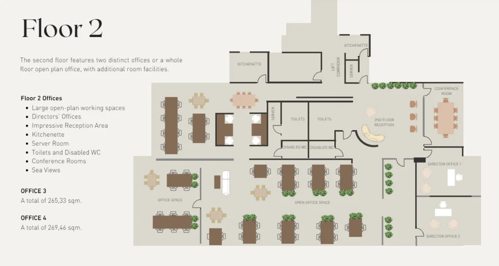 Luxury office for rent in a new business center, which is located in the elite Germasogeia district, on Kolonakiou street next to the Sklavenitis supermarket and has a 360° panoramic view of the sea and mountains from the 4th floor. Project features: raised floors, ceiling and lighting, air conditioning systems (Daikin), two small kitchens on each floor and several bathrooms, two new KONE elevators, reception, access control and CCTV surveillance. The project stands out for its modern design and the use of high-quality materials, luxurious finishes with European accents, the latest multimedia systems and high-speed Wi-Fi, the upper floor with special roof gardens and panoramic views of the sea and the city, high ceilings create an open and airy atmosphere, an impressive facade standing out against the backdrop of the urban landscape, there is underground parking (21 parking spaces) and 3,500 m2 private behind the building. It is possible to rent the entire building (4 floors + a roof garden), or by floors (2 offices on each floor), or by offices, 1 m2 = 50 euros.