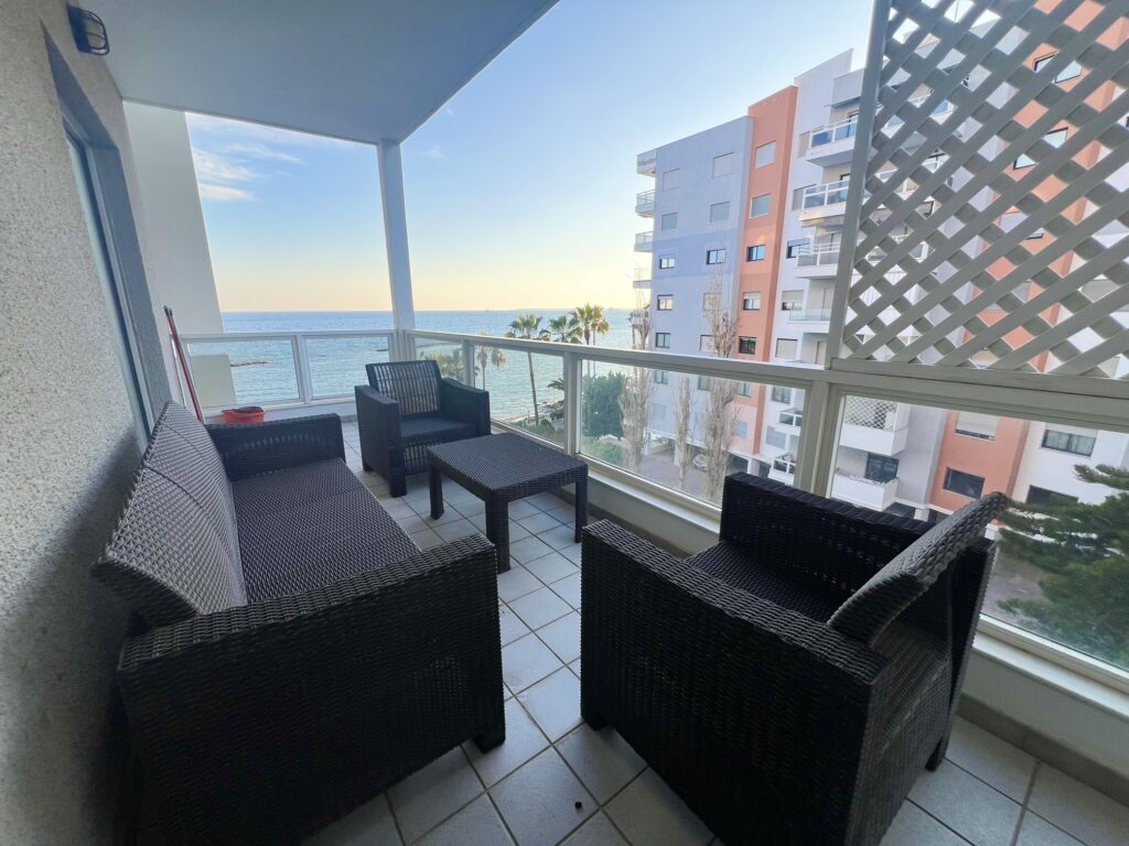For rent a beautiful 2 b/r apartment with a side sea view located on the first line in a private gated complex in Germasogeia, within walking distance to all kinds of amenities. The internal area is 81 sq. m + 13 sq. m covered veranda. It consists of a separate kitchen, a spacious living room with a dining area, two bedrooms and a family shower. The property is fully furnished and equipped with brand-new furniture, a central air conditioning system, electric units for heating, double-glazed windows with blinds, a laminate floor, a water pressure system and uncovered parking. The complex has a swimming pool, outside shower, WC, lockers, garden, private access to the beach and an electric gate with remote control.