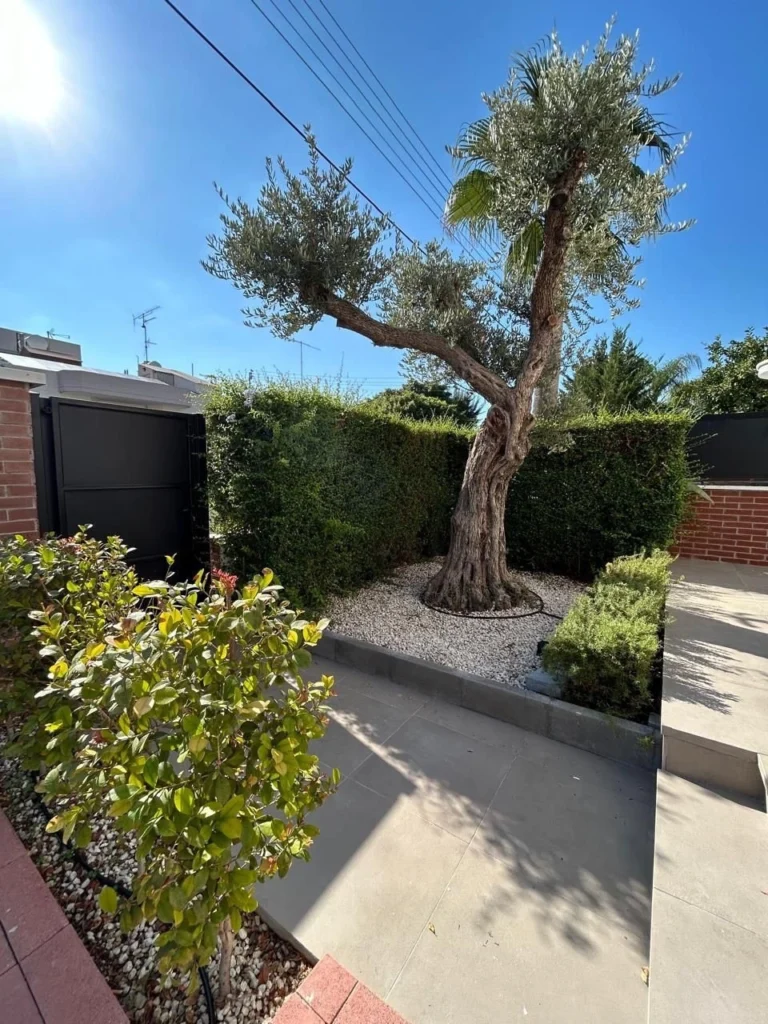 The outdoor terrace, has a lovely garden with mature trees and a parking area .