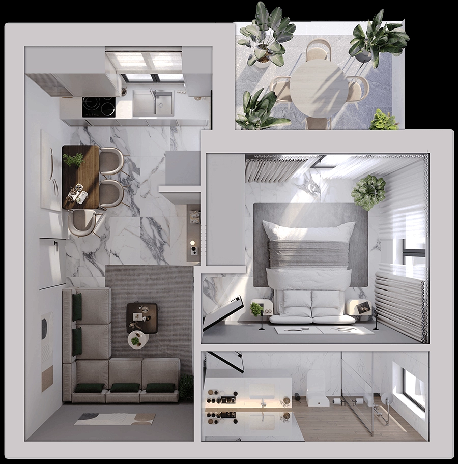 Modern apartment for sale in Trachoni, Limassol. A residence with a living room, kitchen and 1 bedroom, located in a modern residential complex with a swimming pool and garden. The apartment has a terrace, a storage room and a parking space. Thermal insulation technologies have been applied and high-quality materials have been used that meet the highest construction standards.