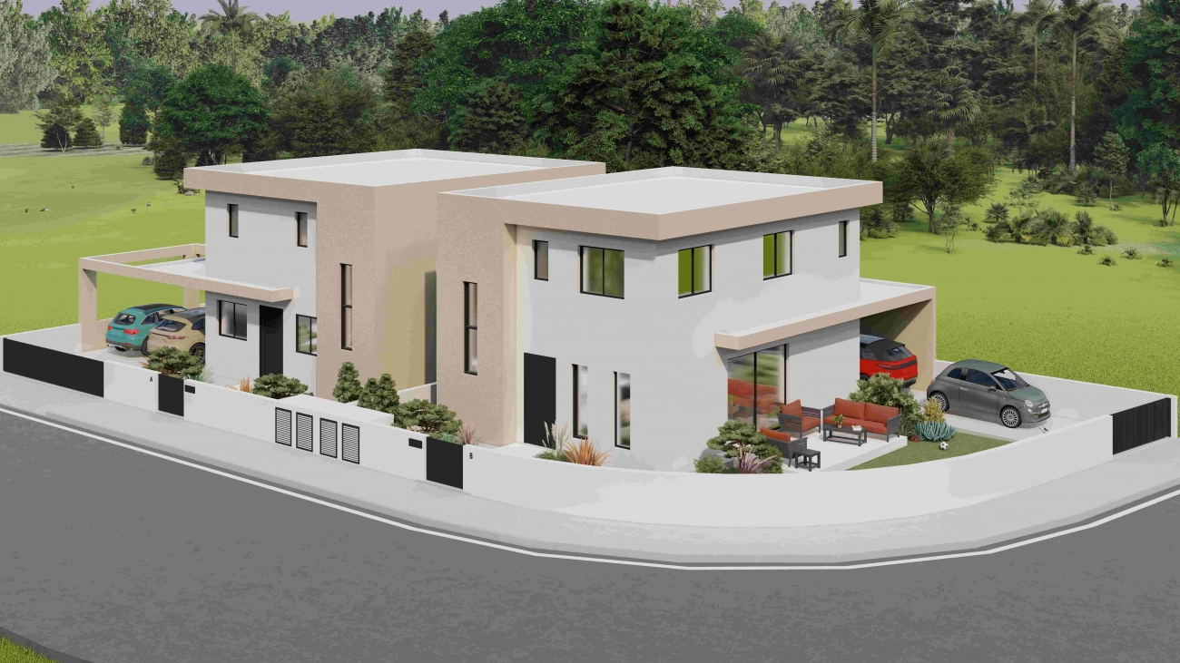 Modern duplex house for sale in Geri area near Pen Hill, Nicosia. The residence on the right side has two levels and is designed with maximum comfort in mind. The project includes an open-plan living room and kitchen, as well as a spacious terrace.It also provides for the installation of a 3 kW photovoltaic system, energy-saving windows, and a thermal facade system. High-quality ceramics and plumbing are used in the construction. In addition, the set includes 2 intercoms and an electric gate. There are 2 parking spaces for cars.Near the complex there are necessary shops and supermarkets, clinics, schools and offices.The project is in the off-plan stage.