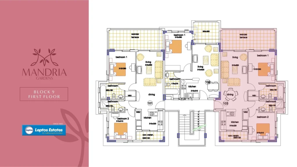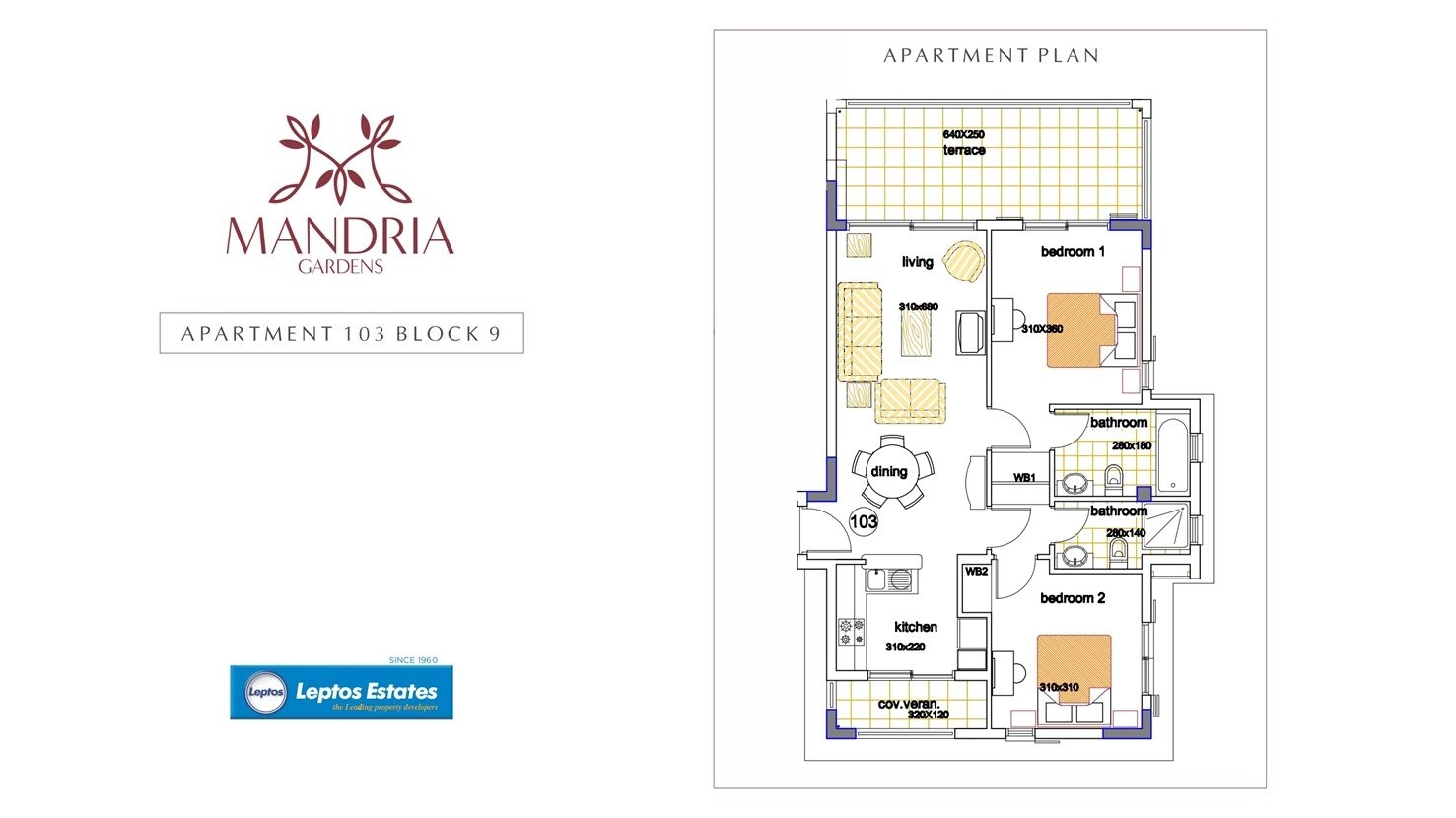 Mandria Gardens Apartment No. 103 is located in an exceptional seafront development that offers one and two bedroom apartments and penthouses and three bedroom detached villas. There are two communal swimming pools one of which is heated during the winter months set in beautiful and spacious landscaped gardens. The project also features a private clubhouse for residential use. The traditional styles fixtures and finishes have been carefully selected to retain the charm and authenticity of the region. Mandria Gardens offers exceptional value for money particularly for those wanting to invest in property as a primary secondary or buy to let investment that is close to golf resorts hotels amenities services places of interest and centrally located between Paphos and Limassol .