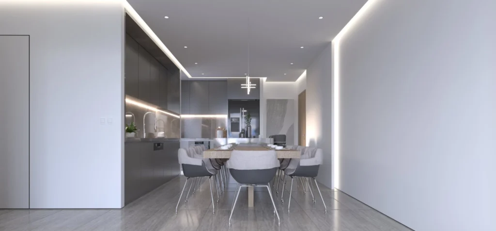 It showcases a modern architectural marvel that seamlessly blends visionary design with opulent interiors, redefining contemporary living.