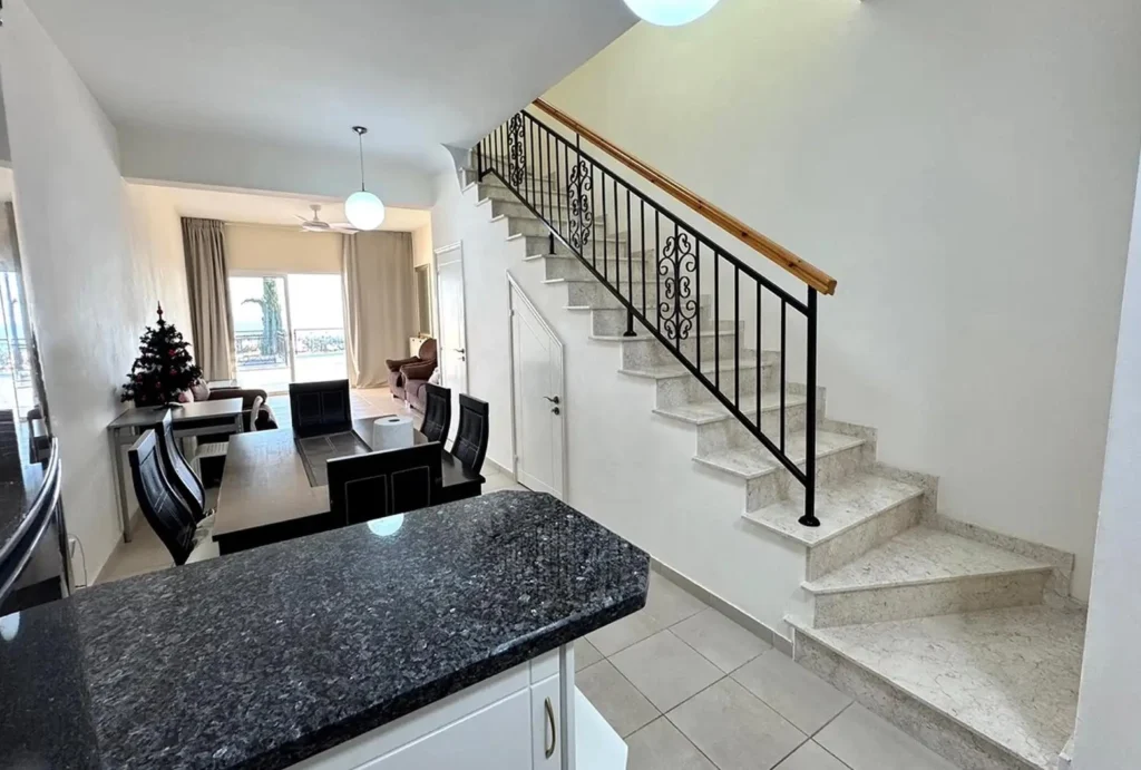 For sale a three-bedroom fully equipped maisonette house with stunning views in Pegeia, Paphos. 124 m2 of covered area + 36 m2 of uncovered terraces/backyard with stone grill + 15 m2 of covered parking for 2 cars in the courtyard foundation are also included in the title. All bedrooms are equipped with bathrooms (2 with showers, the master bedroom with a bathtub) and fitted wardrobes. There is a guest bathroom in the kitchen. Doors to terraces/balconies/backyards from each room. The house is located 5-8 minutes drive from the best sandy beaches (Coral Bay, Coralia, etc.), the largest seaport in Cyprus (construction of which is scheduled to begin this year), grocery stores, 3 pharmacies, English schools, the Paphos Zoo, a large horse ranch with horse riding lessons for adults and children, etc. A private kindergarten is just a 2-minute walk away, while the state Greek Kindergarten, the Greek School of Peyia and the central square of Peyia with restaurants, bars and all communal amenities are a 6-8-minute walk away. The communal pool was completely renovated in 2023. Two staircases lead from the parking lot to a spacious terrace with a swimming pool. It is hidden from prying eyes, except for the residents, no cars and people will ever disturb you. All furniture, kitchen appliances and equipment, washing machine, stone grill, etc. are included. A new filter for drinking water is installed under the kitchen sink. New high-quality ceiling fans (5 pieces) with powerful LED elements are installed throughout the house.
