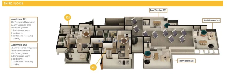 Third floor apartment for sale in Oroklini, Larnaca. It consists of an open plan kitchen, living, dining area, a family bathroom, two bedrooms, master bedroom en suite with shower, covered veranda and a large roof garden with amazing view. Moreover, the apartment has a spacious pool view covered veranda. The residents will have exclusive right of use to a covered parking space and storage, while they can enjoy the complex’s common facilities.