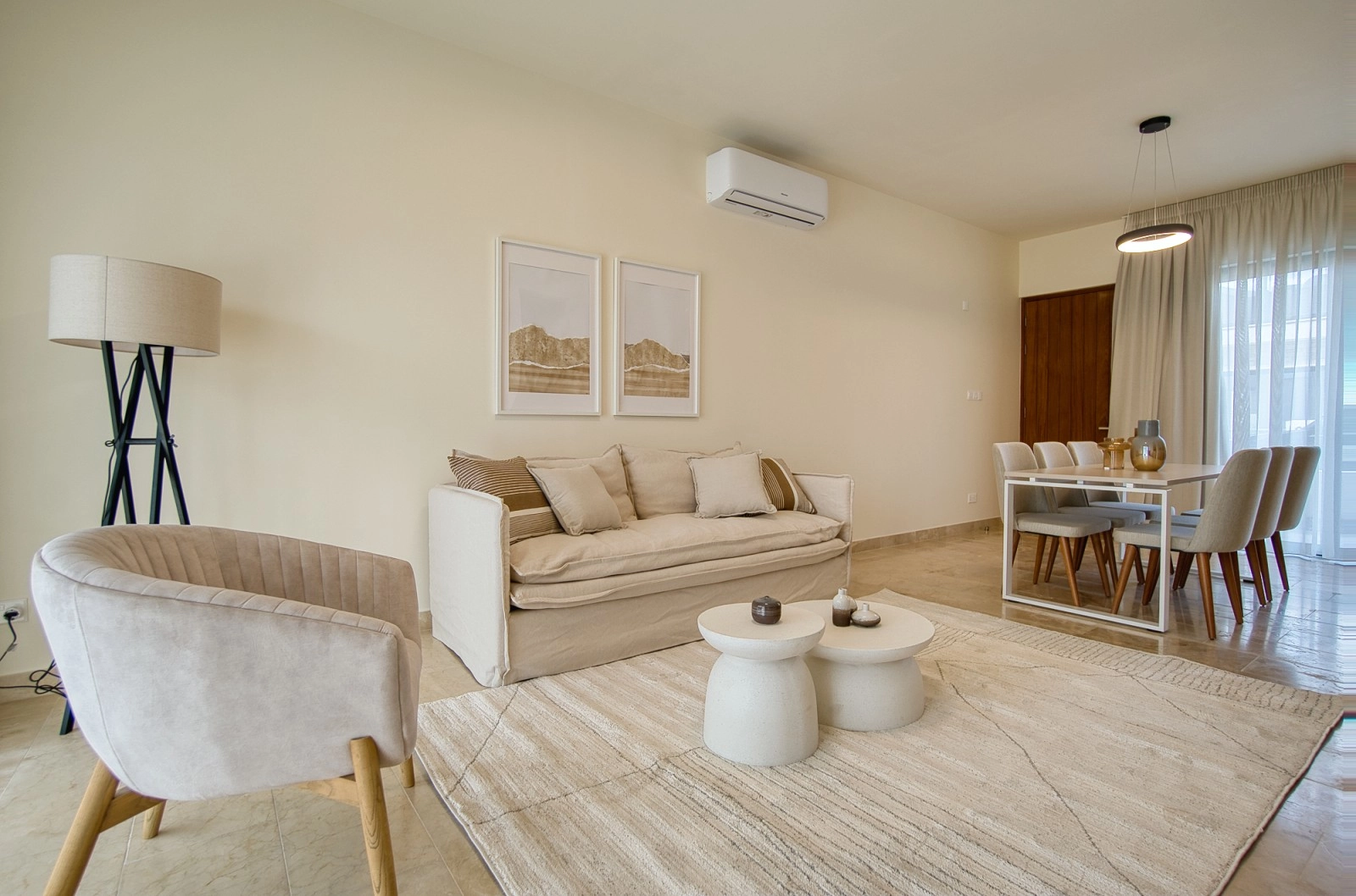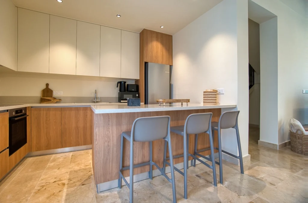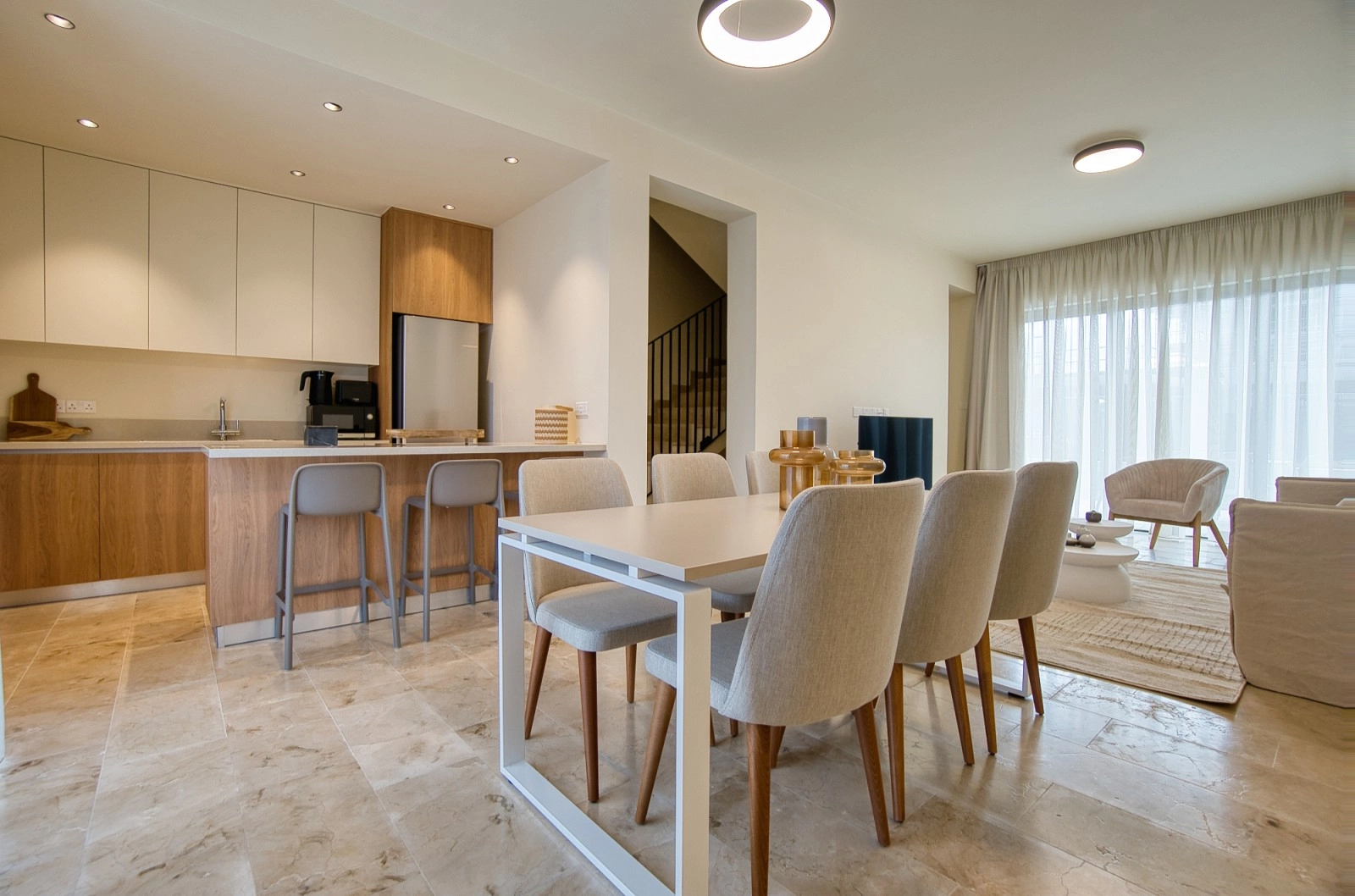 This brand-new, modern 3-bedroom detached villa is located in the picturesque village of Emba. Known for its serene ambiance, Emba is a charming Cypriot village just a short drive from Paphos. it offers a perfect combination of tranquility and accessibility, with local tavernas, essential amenities, and a strong sense of community. The village’s rich cultural heritage and proximity to stunning coastline views make it an ideal place for those seeking a relaxed Mediterranean lifestyle. Upon entering the property, you are greeted by a bright open-plan living, dining, and kitchen area. The modern design flows seamlessly, creating a functional yet stylish living space. Sliding glass doors lead out to a covered veranda overlooking the communal swimming pool, offering the perfect spot to relax or enjoy al fresco dining. A guest toilet is conveniently located on the ground floor for added comfort and practicality. The first floor comprises three generously sized bedrooms and two well-appointed bathrooms. The master bedroom boasts an en-suite shower, providing privacy and convenience. The two additional bedrooms share a bathroom with a bathtub, making it an excellent setup for families or guests. This villa is fully furnished with tasteful modern furniture and features a fully equipped kitchen, ensuring a ready-to-move-in experience. For year-round comfort, the property is fitted with air conditioning throughout. Terms of Payment: The rental terms include two months’ deposit plus one month’s rent in advance. This stunning villa combines modern design with practical living and is perfectly located in the heart of Emba Village. it’s an ideal choice for families or anyone looking for a long-term rental in a peaceful yet convenient setting.