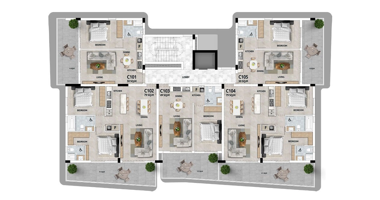 Each apartment is designed to maximize natural light, offering expansive living spaces that are both stylish and comfortable.