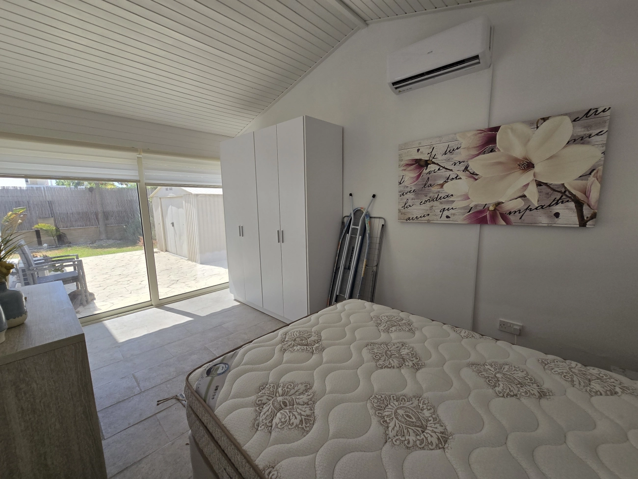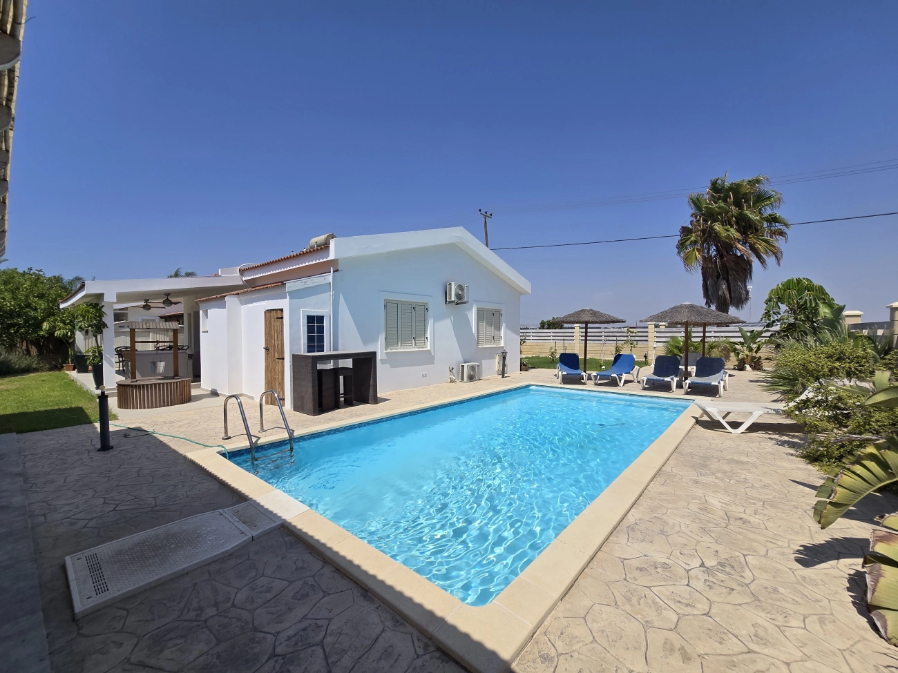 A bungalow for sale in the Meneou area, Larnaca. The total area of the house is 130 m2, it is fully furnished and is located on a plot of 600 m2. The villa is one-storey, with a private pool, a large garden, a spacious covered veranda and a pergola with a barbecue area. The house has three bathrooms, a storage room, a balcony, a covered parking and a fully installed air conditioning system in all rooms. The property has been completely renovated both inside and out. Located near a private sandy beach. There is a title of ownership.
