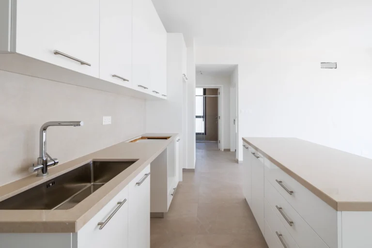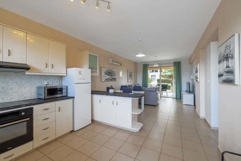 The apartment’s open living/dining area seamlessly blends with a partially separated kitchen, creating a welcoming space. From this first-floor unit, you can enjoy the views of landscaped communal green areas and sparkling swimming pools.