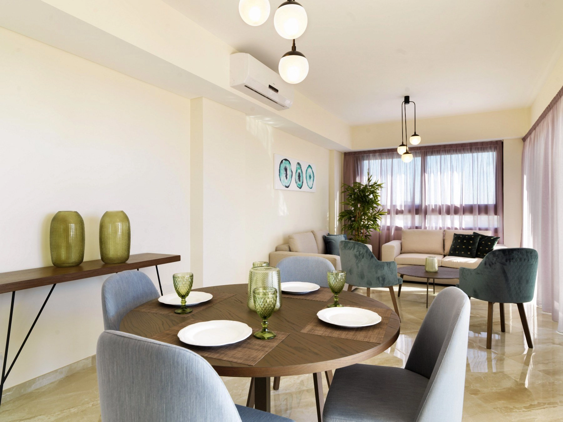 The elegant apartments showcase a harmonious blend of aesthetics and practicality. Bright and stylish, they are constructed with superior quality building materials. The spacious living room areas are perfectly designed, allowing natural light to showcase all the impressive details.