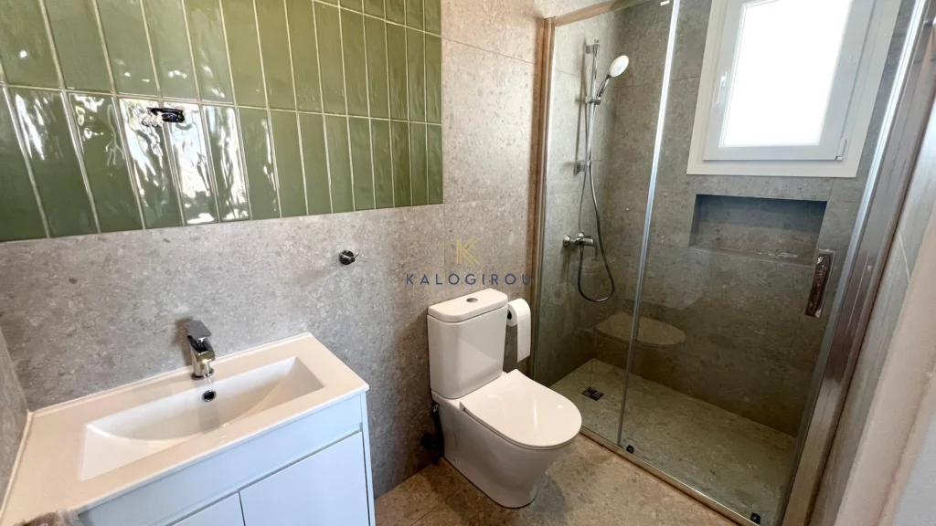 Apartment for Rent in Kamares area. The apartment has an internal covered area of 79 sq.m and features an open-plan kitchen with dining and living area, a 12 sq.m covered balcony, one main shower with W/C, and two bedrooms—one of which has an en-suite shower with W/C.