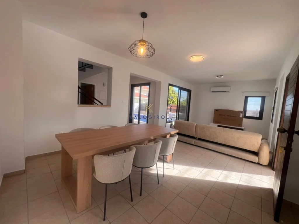 House for rent in the Oroklini tourist area, Larnaca. The property consists of a separate kitchen, a spacious living room with dining area and a guest toilet on the ground floor. The first floor consists of three bedrooms, one main shower, one en-suite shower and a balcony with pool view. The house can be offered either fully furnished or unfurnished, depending on the tenant’s needs.