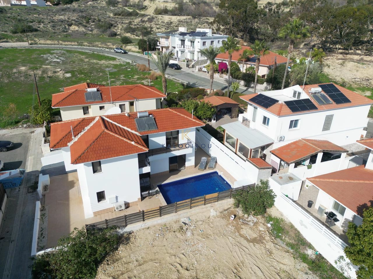 Externally, the property features a veranda with a private swimming pool and covered parking. The area of the property is characterized as residential and quiet, offering privacy and comfort for long-term living.