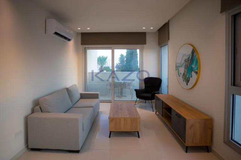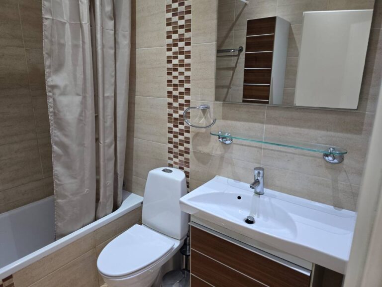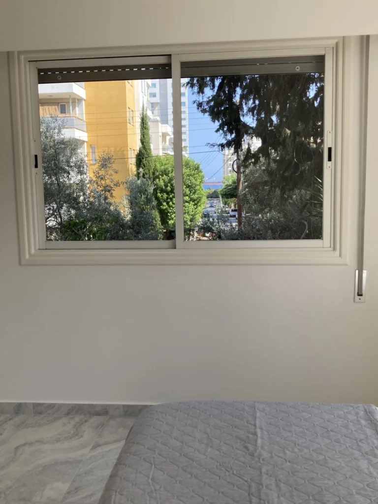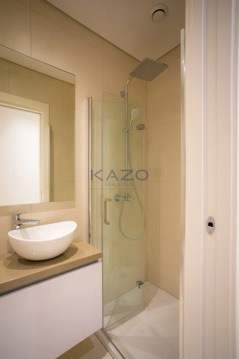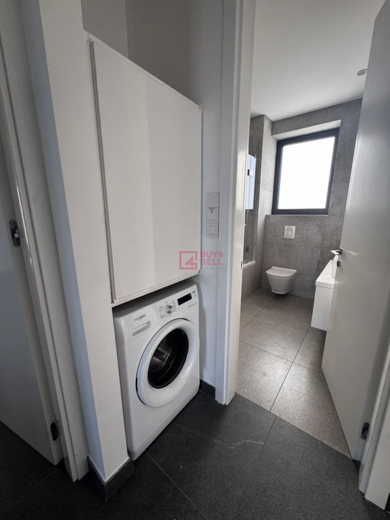 Step inside to find a fully furnished interior with contemporary finishes. The living and sleeping area is arranged for maximum use of space and includes a comfortable bed, sofa, work desk, and storage solutions. The open kitchen is equipped with modern appliances and a dining area, perfect for meals at home. A clean and functional bathroom completes the studio, offering all the essentials in a practical layout.