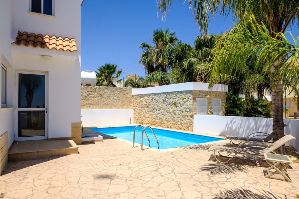 Chara Cynthiana complex consists of sixteen independent three-bedroom villas with private pools and parking spaces. It was designed by the architect Giannis Neophytidis and built by ST. CHARA DEVELOPERS LTD. The project has an energy efficiency certificate C and is exempt from VAT. The last available villa No. 1 is built on 273 sqm of land and has 128 sqm of clean interior space, which includes three spacious bedrooms, open plan living room kitchen, guest toilet, main bathroom and storage. The house was renovated in August 2021 and is in excellent condition.