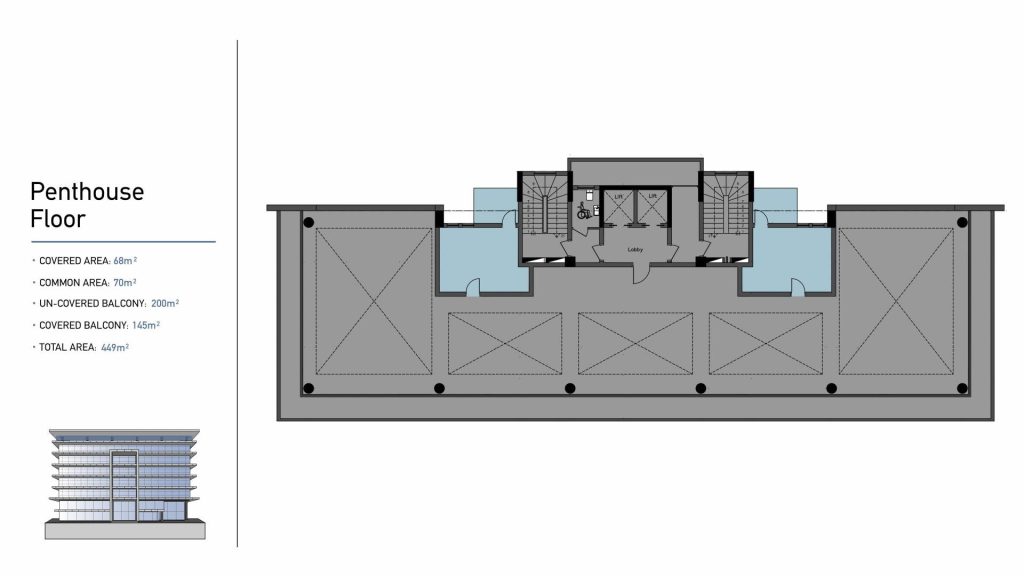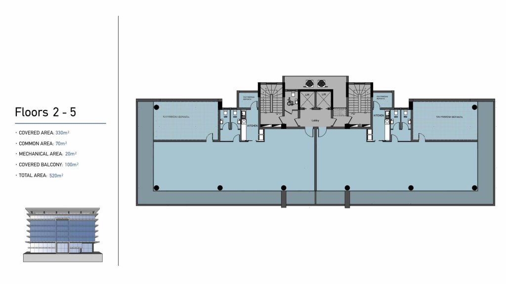 Generally: the building features a well-designed modern façade with generally top quality and high standard materials that consist from high quality glass, alucobond profiles and fair face beton, featuring the following high standard figures.