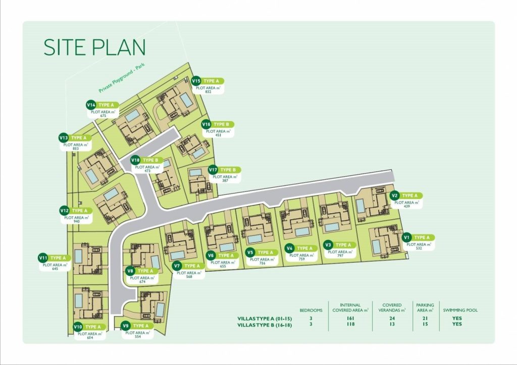 Green Valley consists of 18 three-bedroom detached luxury villas measuring up to 160 m², with private pools and large landscaped gardens.