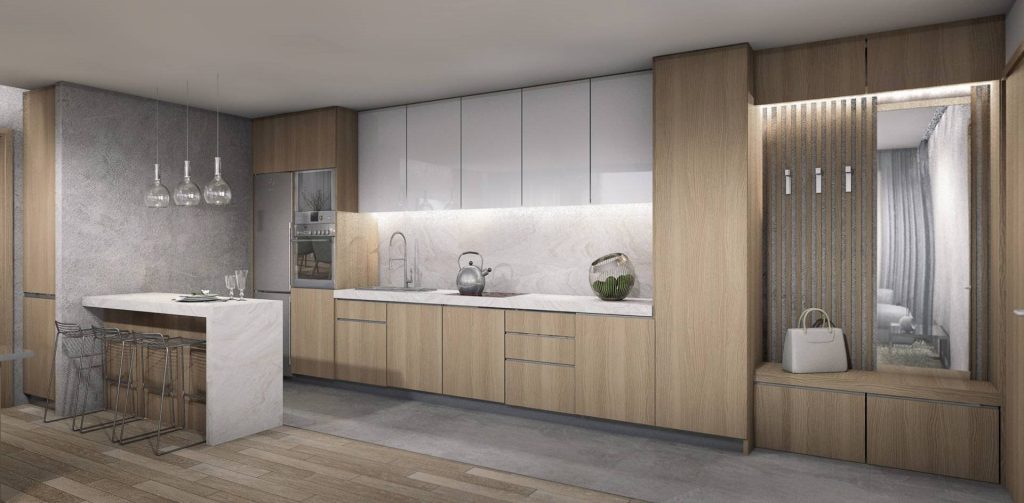 Kitchen with melamine interior 18 mm water proof and laminate doors. The lid of the kitchen countertops will be made of granite.