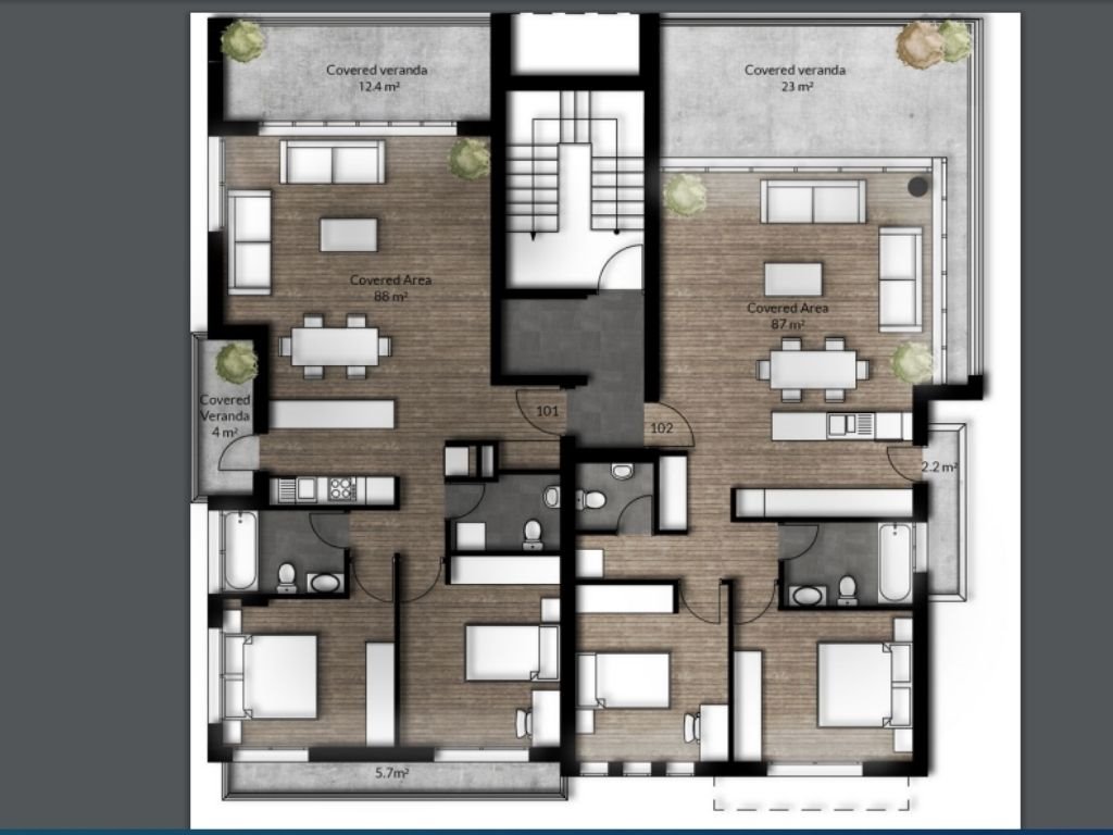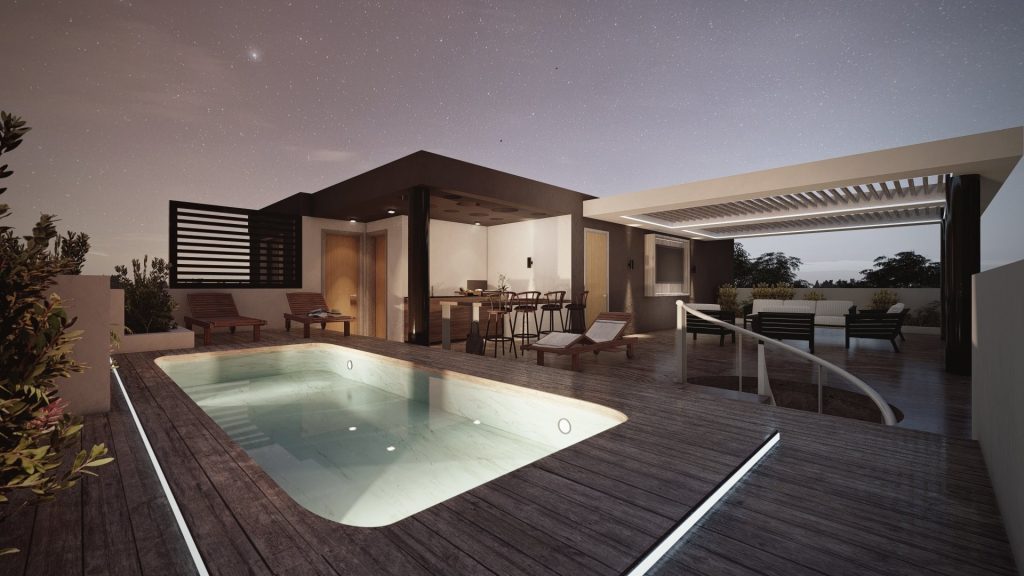 The project has four two-bedroom apartments on the first and second floors and a four-bedroom penthouse on the third floor with a private garden and swimming pool. The Motivo apartment house is located in a quiet area, but at the same time in the city center.