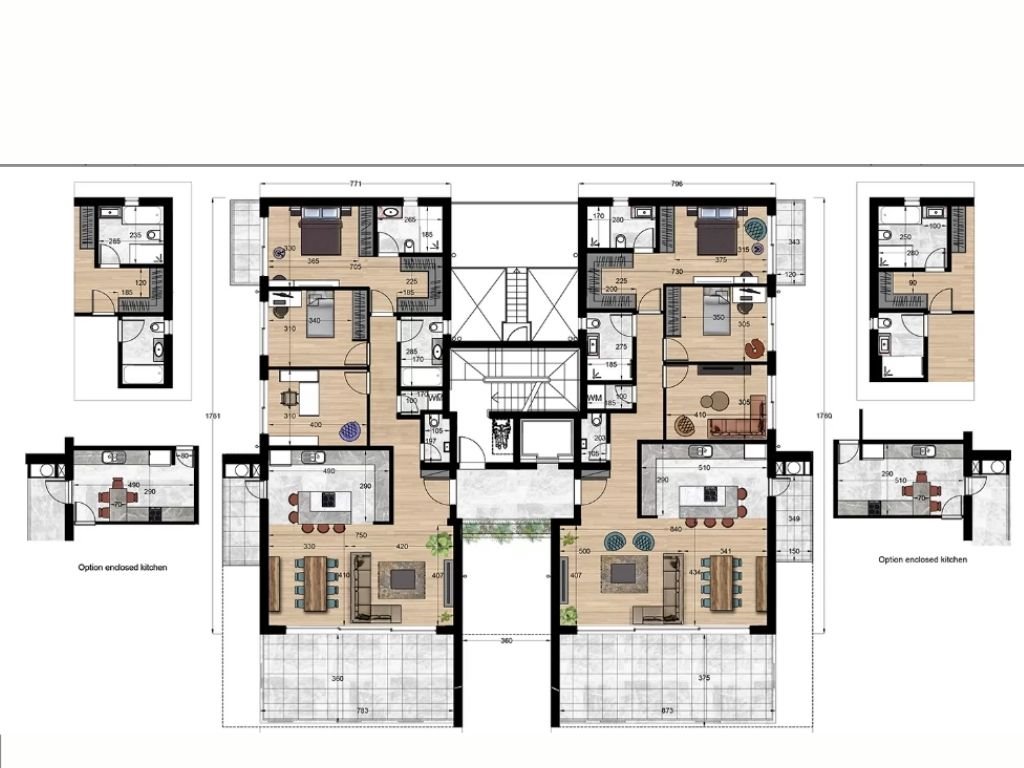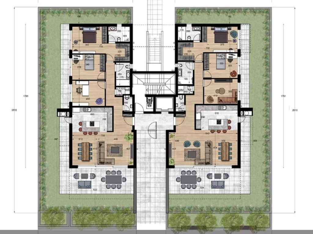 The attractive design of the buildings ensures that each apartment is completely independent, without common walls, and that each apartment has three distinct sides providing unobstructed light, ventilation and views. Such a thoughtful layout guarantees maximum privacy for each apartment. As an additional feature, each building is named after a local tree that adorns each facade, embodying the natural Cypriot flora and the atmosphere of the Mediterranean.