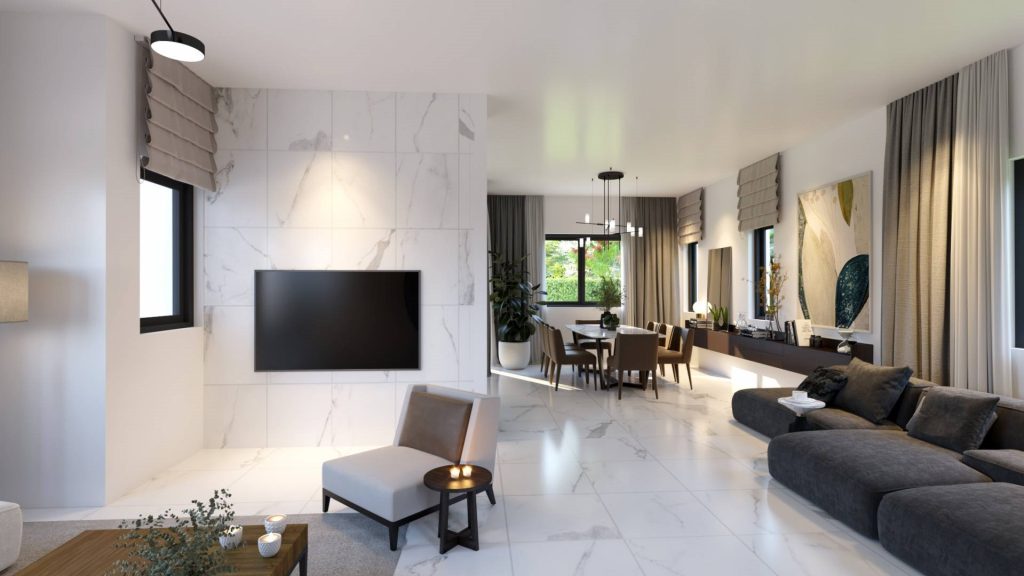 The characteristic modern style is in keeping with today’s lifestyle: the villas are set on large plots with off road parking and an additional pool. Five villas are uniquely designed, including natural stone facades. The spacious, well thought out interiors have bright, airy rooms, some of which open onto sunny terraces. Excellent finishes in every respect throughout: high-quality windows and doors, attractive ceramics for floors and walls inside and out, as well as first-class bathroom and kitchen fittings and joinery.
