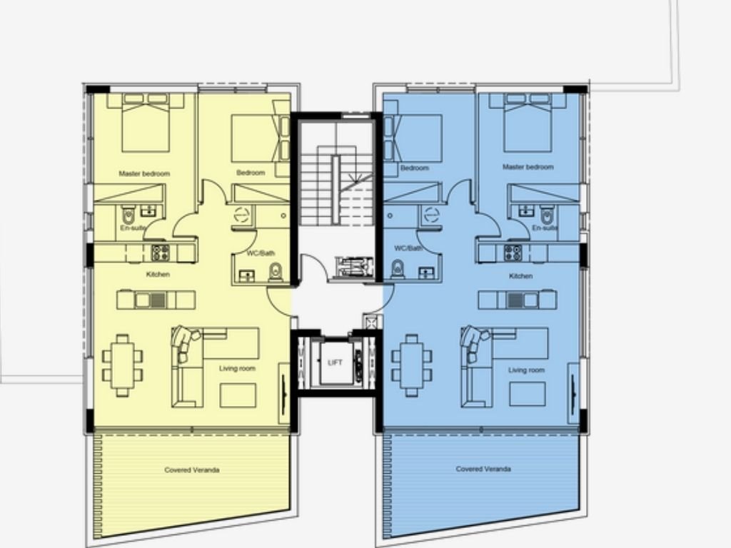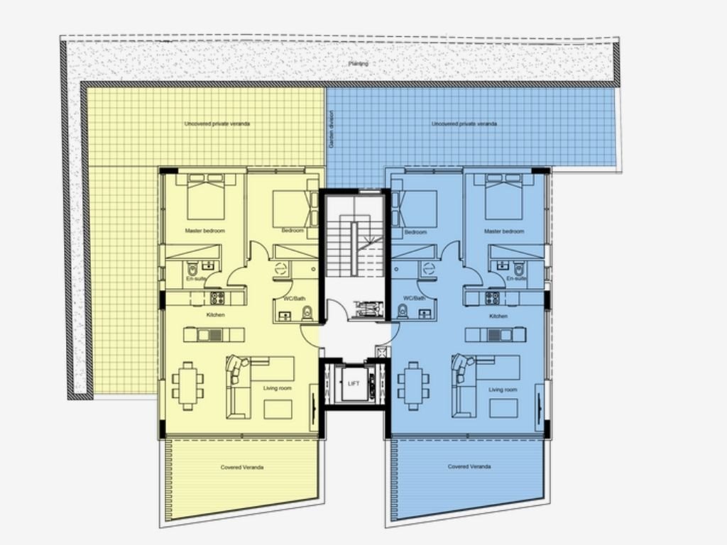 The 2-bedroom apartments offer a spacious living area and verandas. The ground floor apartments have an additional 45 m2 – 65 m2 of garden, and the penthouse with a private roof garden is 296.5 m2.