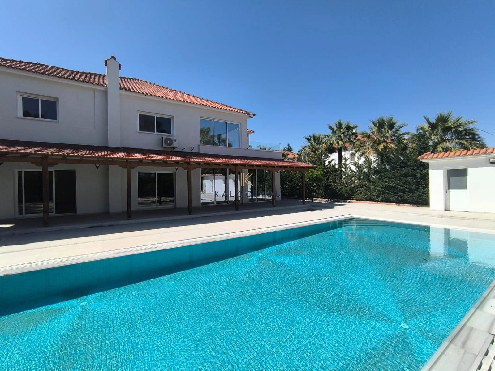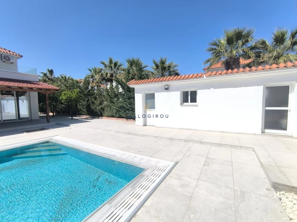 Villa for rent in Pervolia area, Larnaca. This remarkable house on the ground floor it consists of an open plan living room and dining area, a separate kitchen, one bedroom, one shower with WC and fireplace. On the first floor it consists of 4 bedrooms, en-suite bathroom with Jacuzzi in the master bedroom, en-suite shower in the second bedroom, one common shower, storage room and utility room in the hallway. All rooms in the house have A/C. Externally, this amazing house has a large covered veranda with pergola, garden, large swimming pool and covered parking. The area of the property is characterized as residential and quiet.