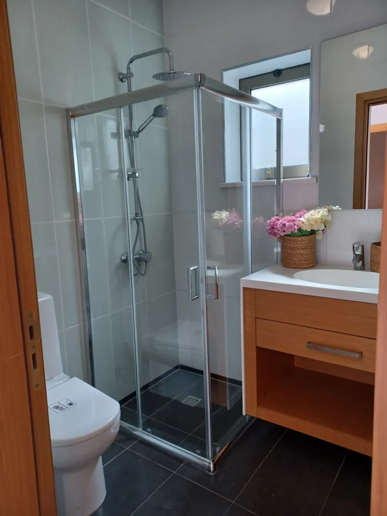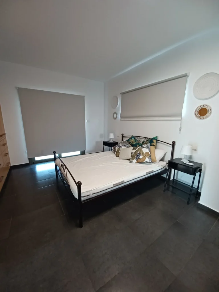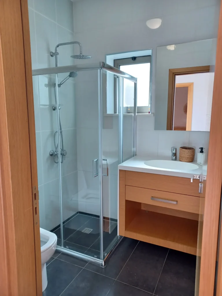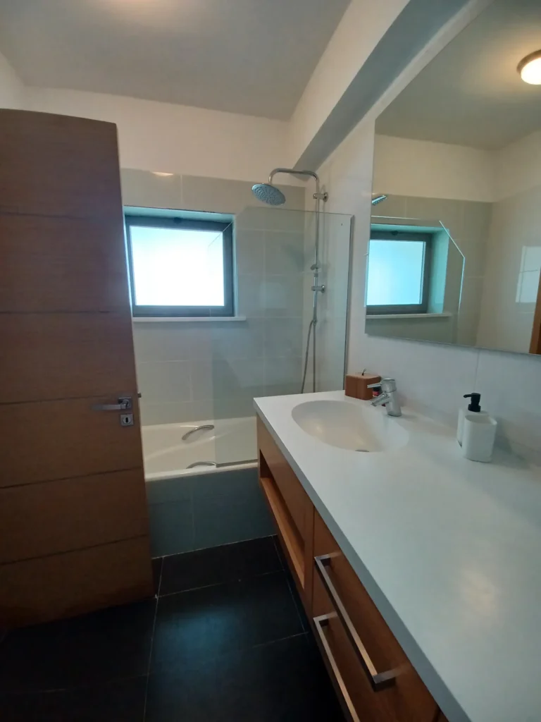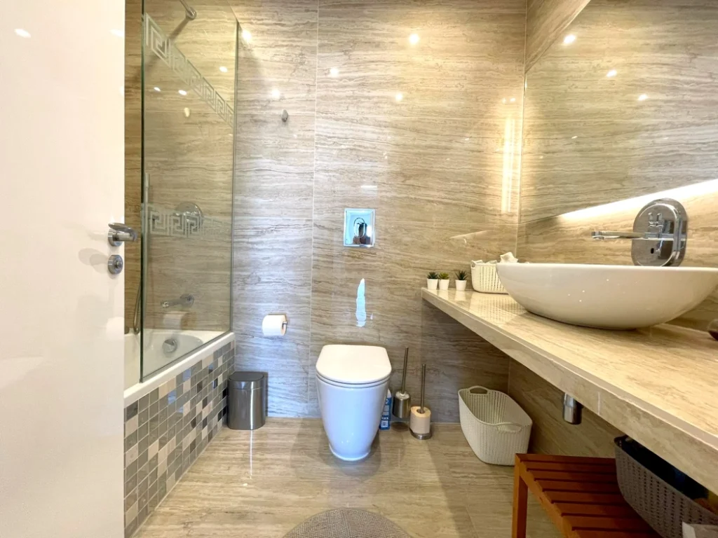 Stairs lead down to the villa from the main road. The property begins with an open plan living and dining area with an attractive stone feature wall and a fireplace. Patio doors open out to a spacious covered veranda, complete with barbecue area, which provides the perfect opportunity for al fresco dining while taking in the sensational scenery. The modern kitchen is separate and features high quality, stainless steel appliances, and ample worktop and cupboard space. An en-suite bedroom with shower facilities can also be found on this floor, with a large picture window offering beautiful views of the sea. A guest toilet completes this floor. There is also a laundry room with a shower and a toilet in this outdoor area.