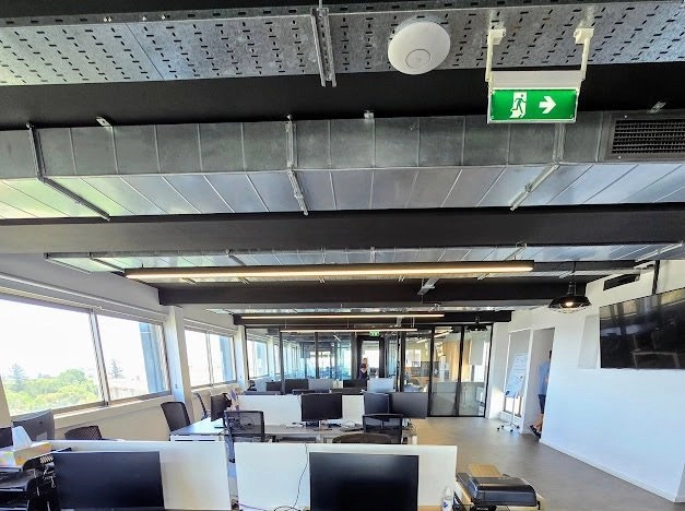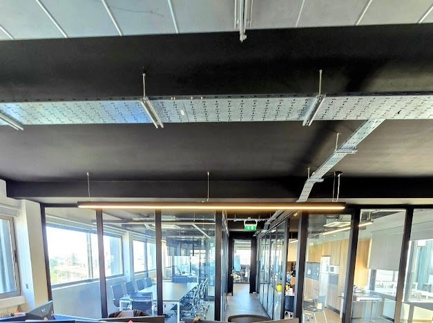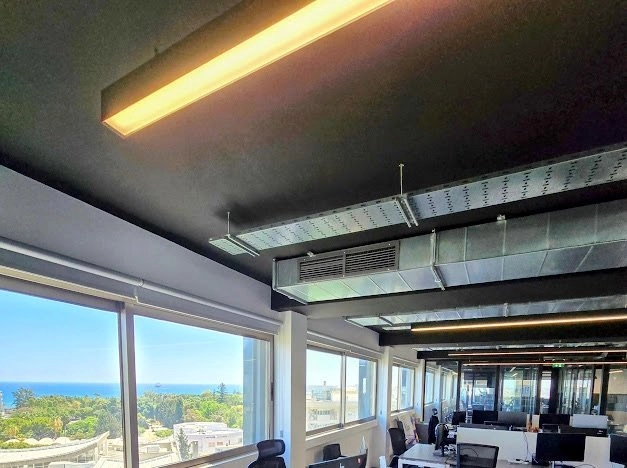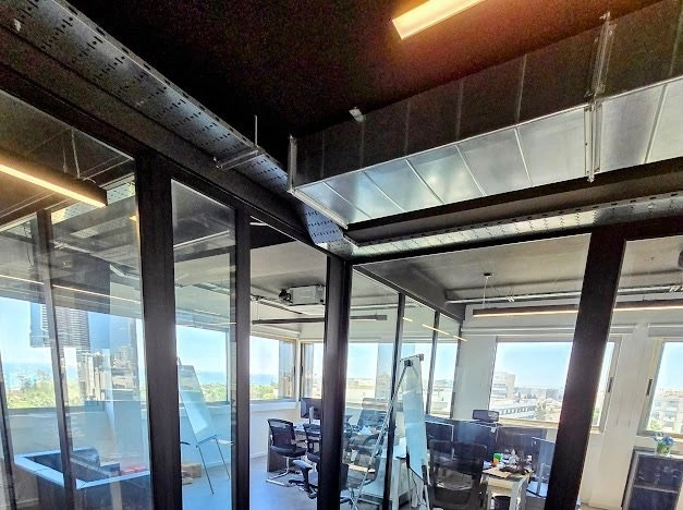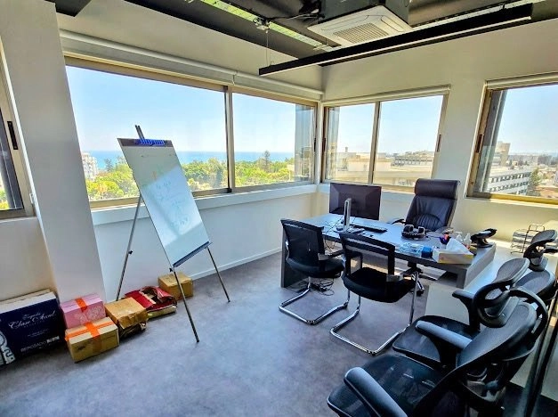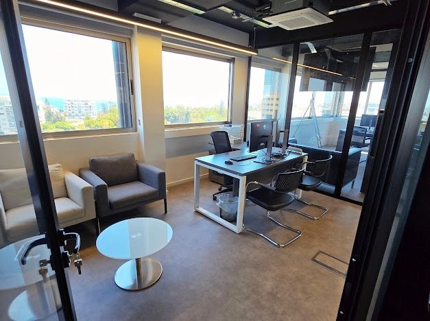 1Modern Office – 400 SQM – Agios Nikolaos Roundabout Top floor with panoramic sea view from all rooms at the office 10 separate offices + 2 open plan areas + Kitchen + Veranda 4 toilets (2 men's, 2 women's) Can sit up to 50 people Combination of open space and private rooms Industrial design with luxury black aluminum VRV air conditioners Large kitchen LED lighting throughout Double-glazed glass partitions Security cameras Fully Air-conditioned in every room, fireproof server room (Cysec compliant) Sophisticated alarm system Storage room Huge smoking balcony Gated parking