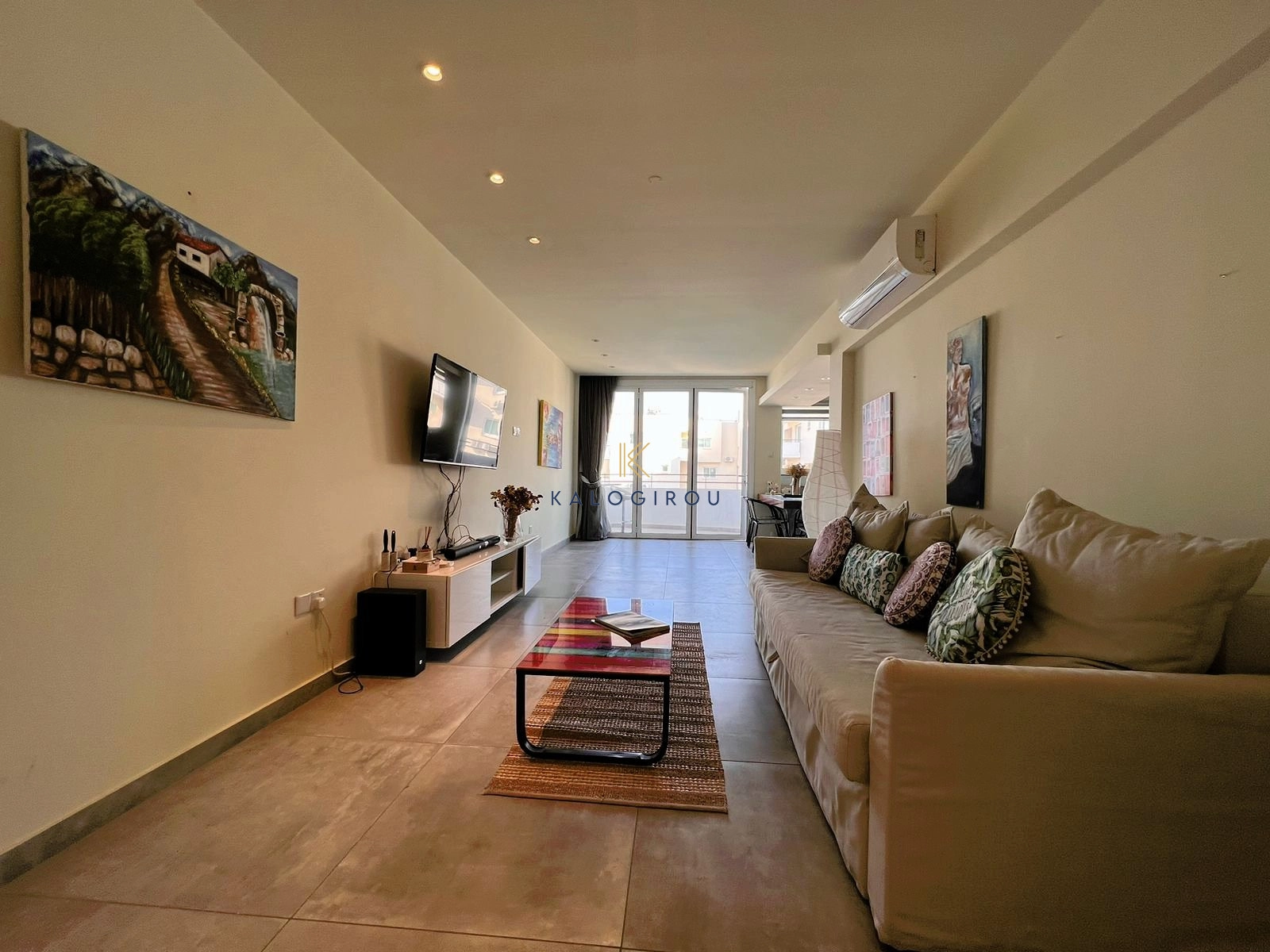 Fully renovated Apartment with hiqh quality specification for rent in Makenzy area, Larnaca. The apartment offers sea view, has internal covered area of 80 sq.m, consists of open plan kitchen with dining area, 22sq.m. covered balcony, living room, 1 main bathroom with 1wc, 2 bedrooms-one of them is en-suite, covered parking.