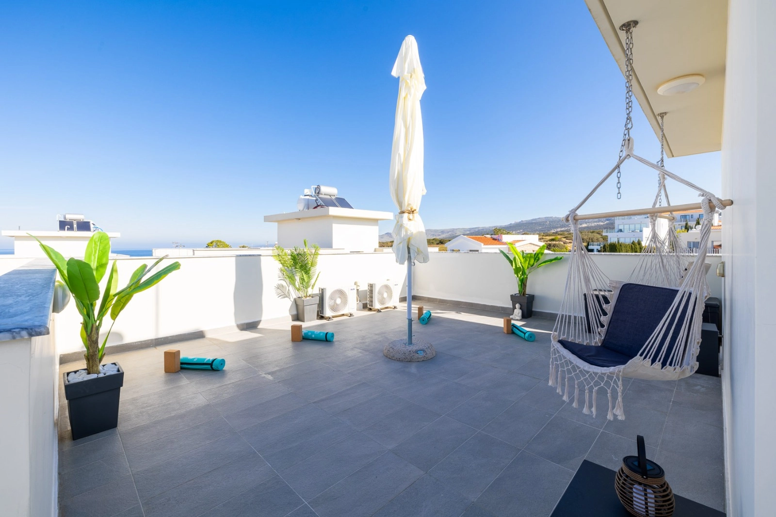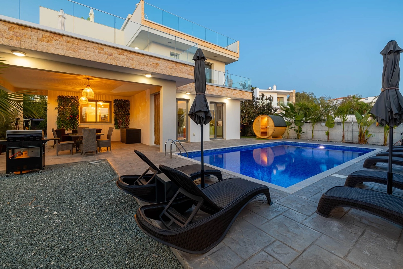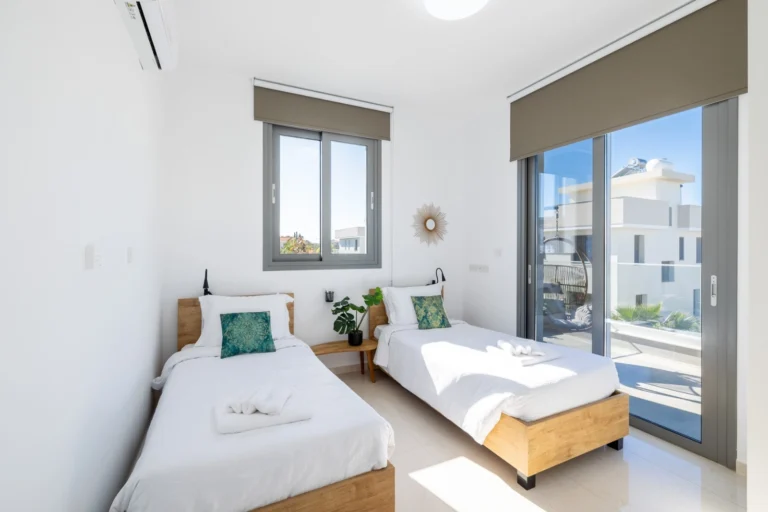 This magnificent brand new sea view villa is located in the exclusive St George area of Peyia, Paphos. St George has a fantastic coastal location, with stunning views of the Mediterranean Sea all around. Just a short drive away from the blue flag Coral Bay beach, the picturesque Sea Caves, and the Akamas Peninsula. All amenities are also close by, including bars, restaurants, shops, a medical center, and an international school. Situated just a short drive away from the beautiful beaches of the Sea Caves region, this 4 bedroom, 4 bathroom newly built villa is an ideal choice for those who dream of a life by the sea. Partially furnished to a very high standard, the villa feels modern and welcoming. Furthermore, air conditioning, underfloor heating, and a photovoltaic panel system for low electricity costs create an energy-efficient and comfortable home environment throughout the year. The ground floor has a well-sized living room with separate dining and kitchen areas. Each of these areas is fully furnished with brand-new items. The kitchen comes complete with all of the expected electrical appliances and has ample worktop and cupboard space. Patio doors lead directly out to the private swimming pool. A bedroom with en-suite shower facilities can also be found on this floor; the room is unfurnished and would make a wonderful playroom or office space. A guest toilet completes this floor. Upstairs there are three en-suite bedrooms, two with a shower and one with a bathtub. Two of these rooms are fully furnished while one is empty, allowing residents to choose how to use this space. A door opens out to a spacious uncovered balcony and from here, stairs lead to the roof terrace where breathtaking views of the Mediterranean Sea can be enjoyed. Outside, a swimming pool takes center stage of a large patio, and there is plenty of space for enjoying the desirable Cyprus climate. To complete the luxurious experience, there is a private sauna and jacuzzi, ideal for relaxation and wellness at home. The property also includes a spacious parking area with room for multiple vehicles. A wonderfully modern home in one of Paphos’ most sought-after locations, offering everything needed for an elevated coastal lifestyle. Distances: Walking distance to the beach and TLC school 2 minutes drive to Cup St George Hotel 7 minutes drive to Coral Bay