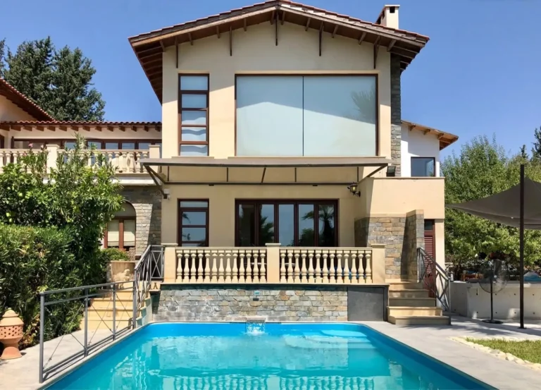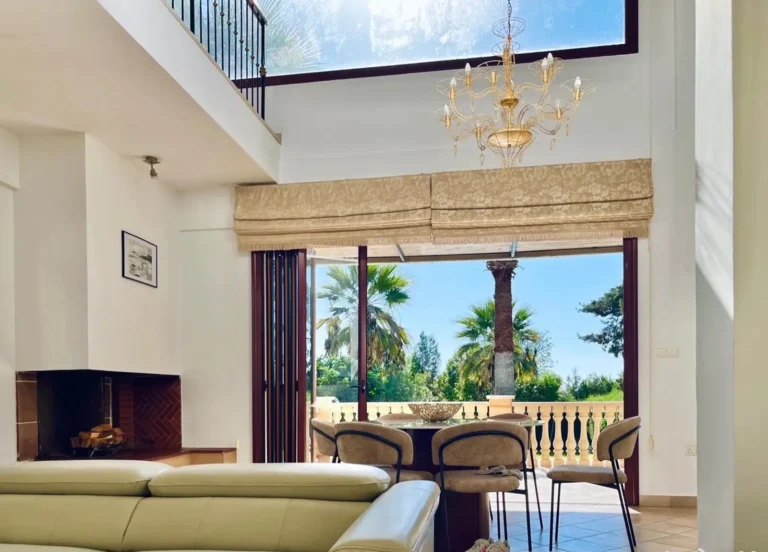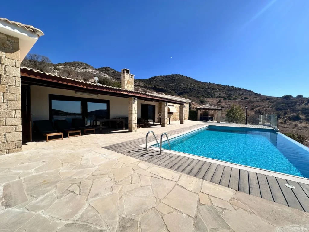 This wonderful 4-bedroom bungalow, located in the tranquil village of Episkopi, Paphos, is designed for refined living and set within a gated 4014 sqm plot. Episkopi offers a peaceful village charm amidst lush landscapes and beautiful mountain views, all while being a convenient drive from Paphos city and its amenities. Spanning 267 sqm, the villa showcases four spacious bedrooms, three of which feature en-suite bathrooms, while the master suite includes a luxurious en-suite Jacuzzi. The use of natural stone accents and a stylish grafiato finish imbue the home with warmth and sophistication. Underfloor heating throughout ensures a cozy atmosphere, ideal for year-round comfort. The open-plan living, dining, and kitchen area is crafted for relaxation and flow, with two fireplaces adding charm and warmth. The interior opens seamlessly onto a large decked terrace and an impressive infinity pool, where residents can soak in panoramic views of the village and surrounding mountains. For those who enjoy outdoor dining and entertaining, the villa also includes a covered BBQ area with seating space. Practical features of the home are thoughtfully designed for modern living, including a guest WC, utility room, double garage, and double gates that enhance privacy and security. The villa is fully furnished, and the kitchen is equipped with all essentials, ready for move-in. Additional conveniences include an alarm system, air conditioning, and ample storage. As a long-term rental, the villa includes pool and garden maintenance, allowing for a worry-free lifestyle that combines the quiet charm of Episkopi with close proximity to the city. This property is ideal for those seeking a blend of luxurious comfort and Cypriot village tranquility.