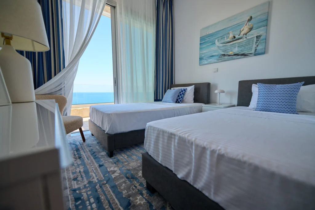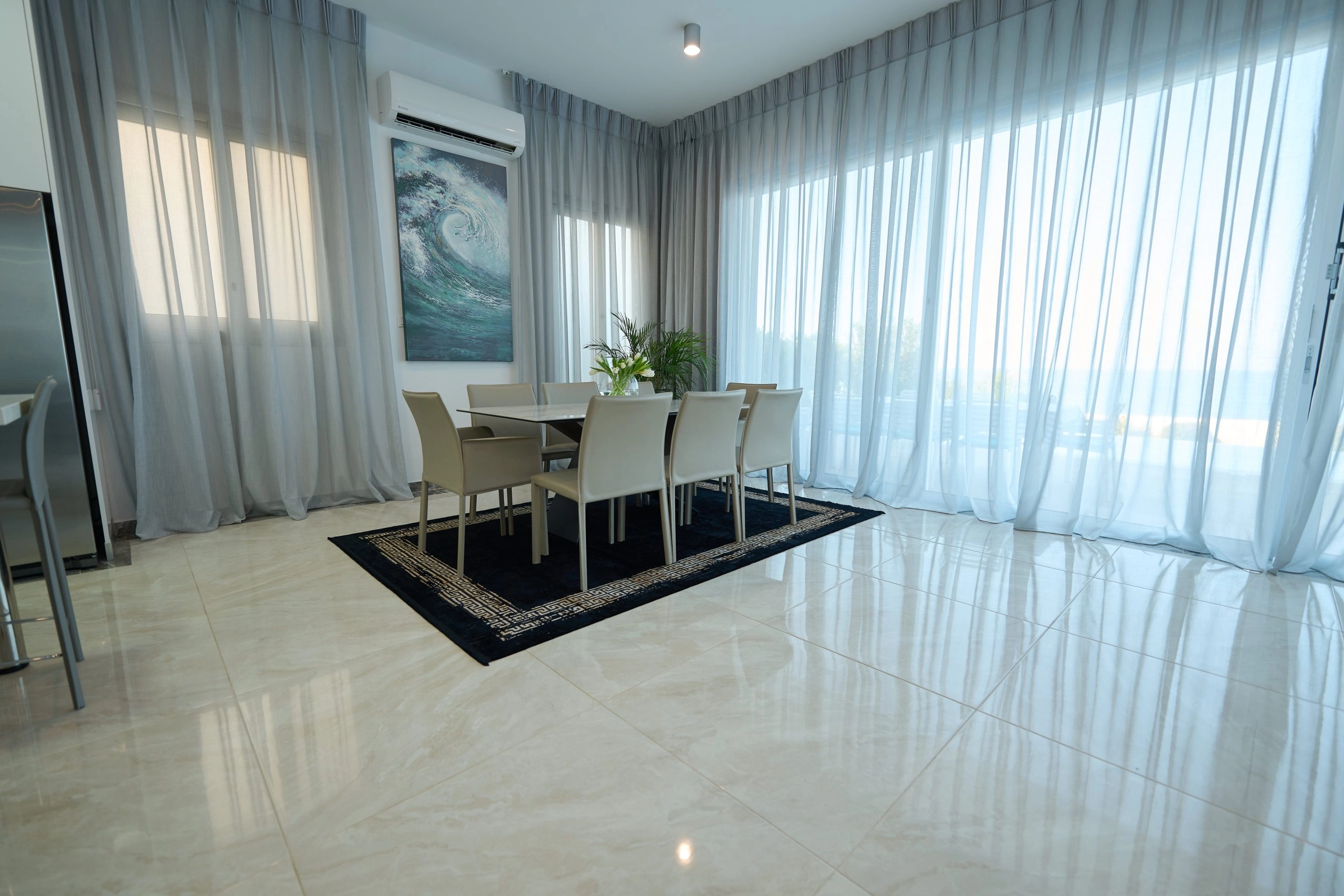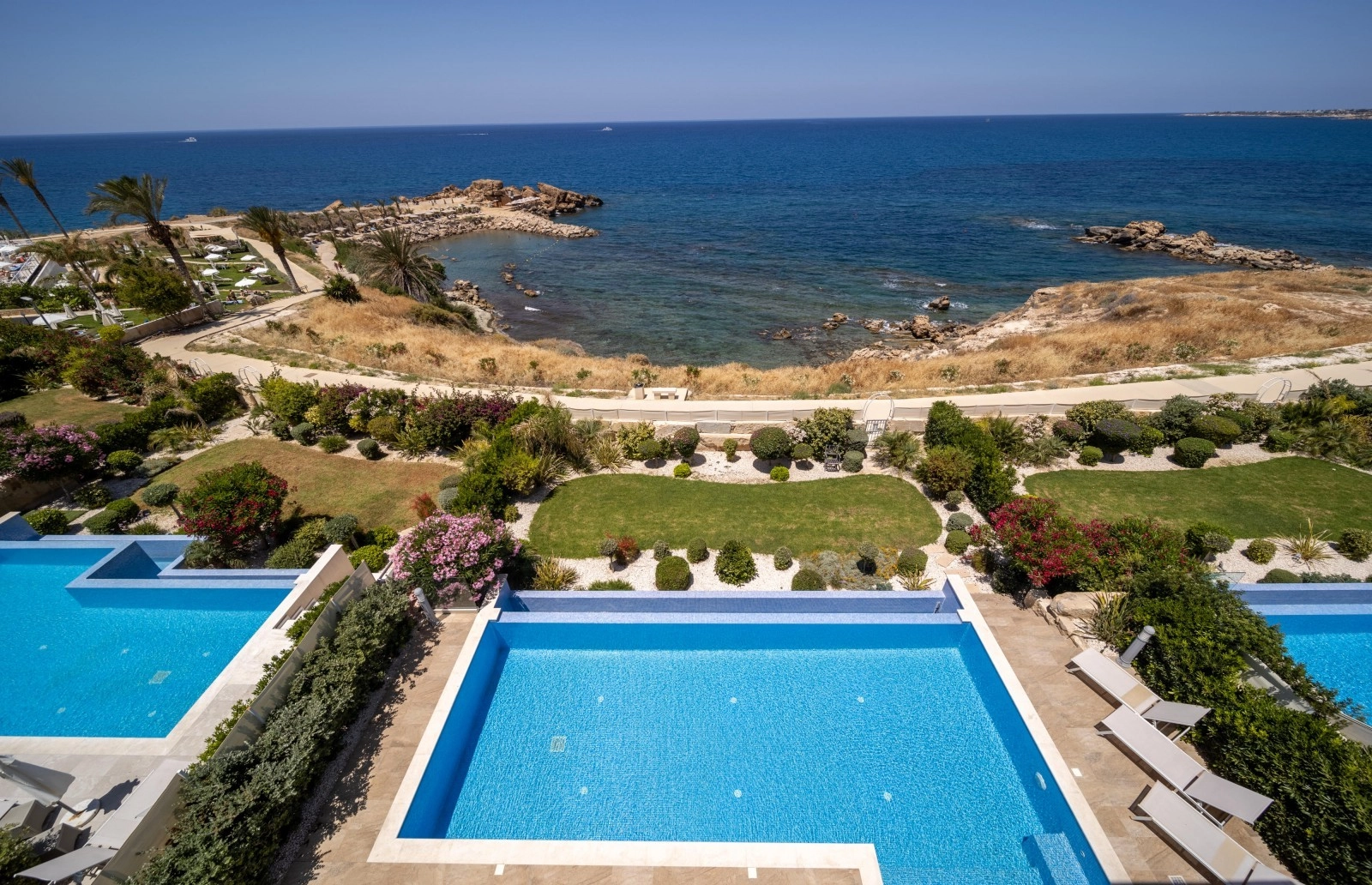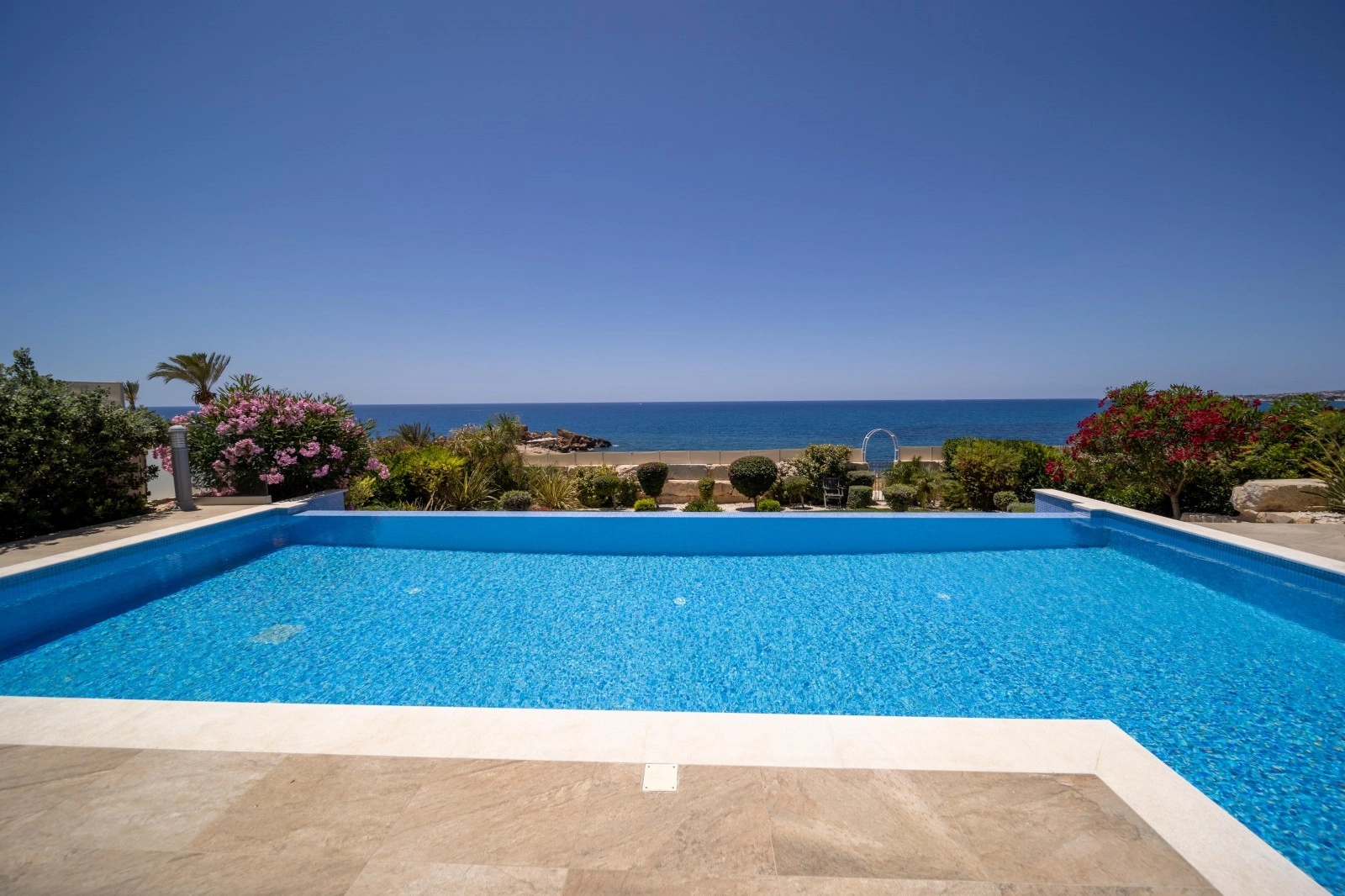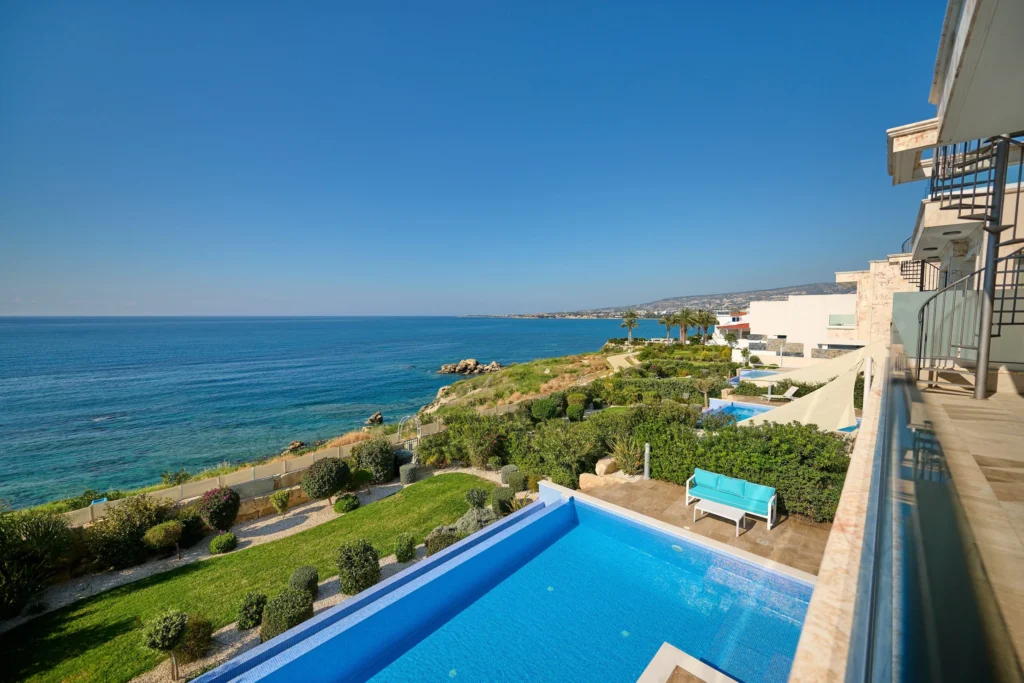 This magnificent beachfront villa is situated in Kissonerga, Paphos. Kissonerga is a village of the Paphos region ideally situated halfway between Paphos and Coral bay. This means that all amenities of both the areas are easily accessible for access to larger supermarkets and malls, however the village itself has a wealth of shops, mini markets, restaurants and bars. Perched on the edge of luxury, this opulent 3 bedroom, 3-storey seafront villa stands as a masterpiece of design and sophistication. Meticulously furnished with high-quality fixtures and fittings, this residence offers an unparalleled living experience. The ground floor unveils a generously spacious open-plan layout, seamlessly integrating the living, dining, and modern fully equipped kitchen areas. Sliding doors effortlessly extend to a covered veranda, overlooking a pristine pool and the azure sea beyond. A guest bathroom enhances the convenience of this lavish space. Ascend to the first floor to discover three en-suite bedrooms, each a haven of comfort. The master suite boasts a private balcony, providing a privileged vantage point for panoramic sea views. Outside, a meticulously landscaped garden surrounds an inviting overflow swimming pool, creating a serene oasis. A roof garden, accessed from the first-floor balcony, offers breathtaking vistas, and direct access to the sea completes the allure of this coastal retreat. This super-luxurious seafront villa is an embodiment of exquisite taste and indulgence, promising a lifestyle of opulence and tranquility by the sea.