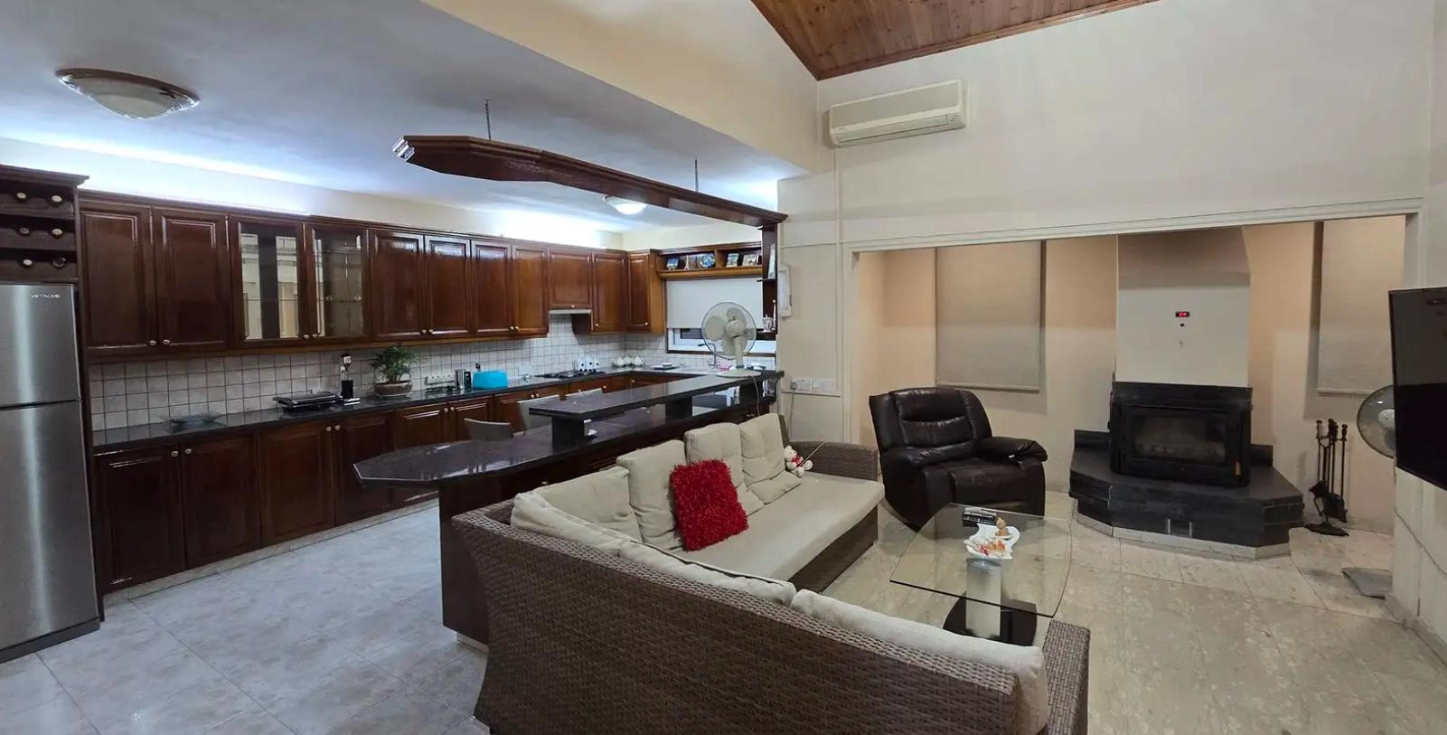 A 4-bedroom villa is available for rent in Nicosia, Palaiometocho. The house has an area of 300 m², and the plot is 2000 m². The villa is fully furnished and ready to move in.The house includes a living room with a dining area, a large kitchen, 4 bedrooms (2 with en-suite bathrooms), a common bathroom with a jacuzzi, a laundry room, and a playroom. There is also a 160 m² garden, a 12×5 m swimming pool with a jacuzzi, a separate maid’s room, and a covered barbecue kiosk.On the ground floor, you will find the living room, kitchen, and a guest toilet, while on the second floor, there are 3 bedrooms and the main bathroom. The villa is equipped with air conditioning, an alarm system, and a fireplace.There is covered parking for 2 cars and gates. The villa is located in a quiet area with easy access to amenities.