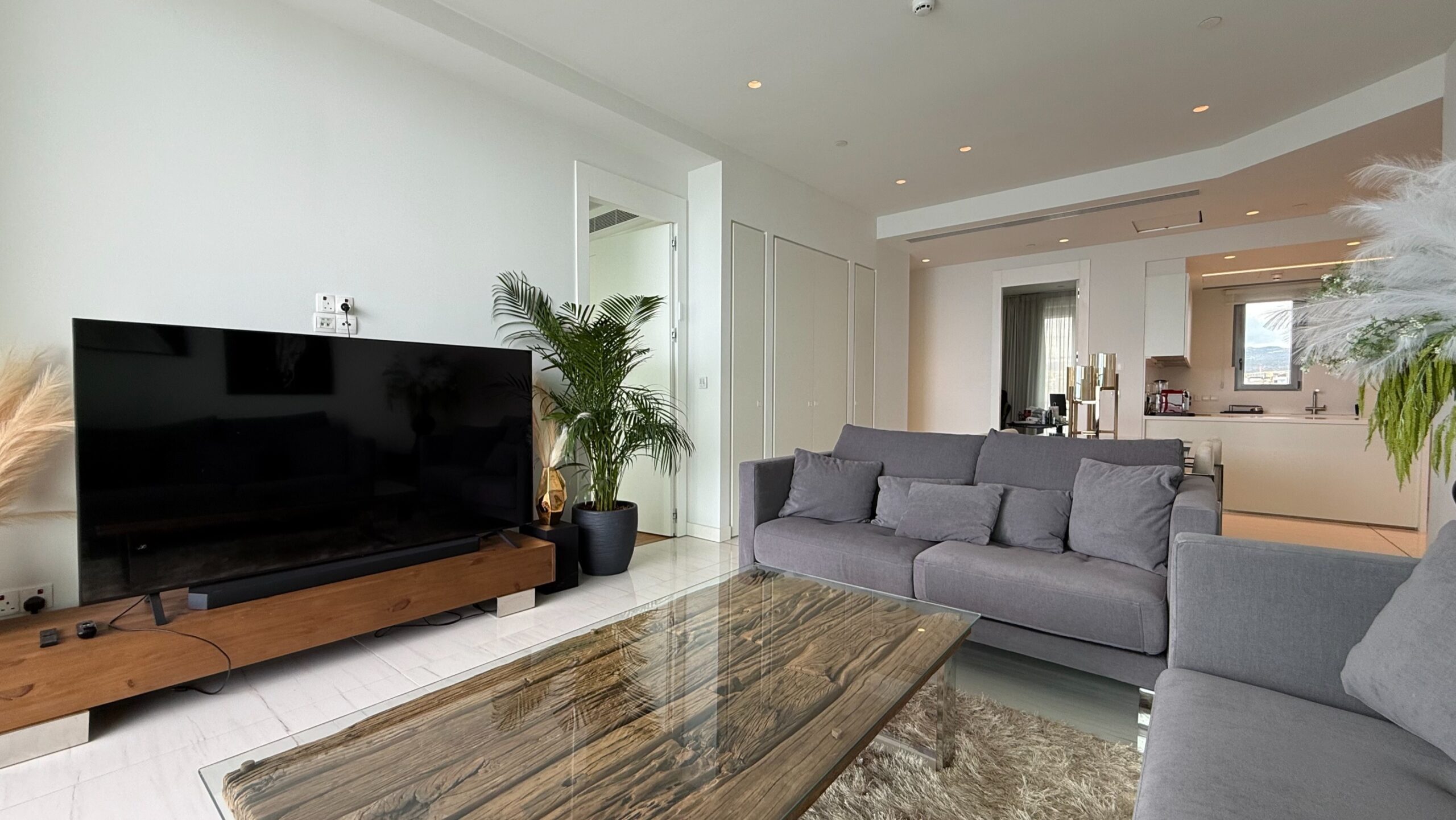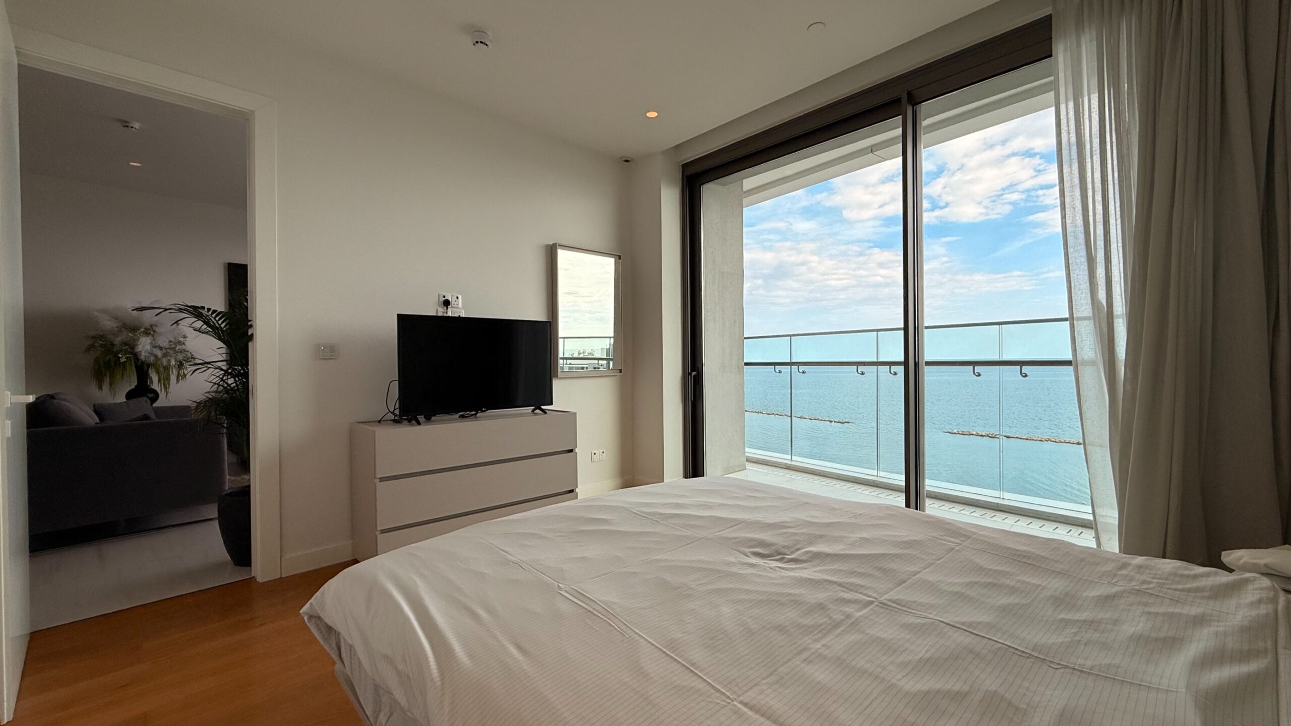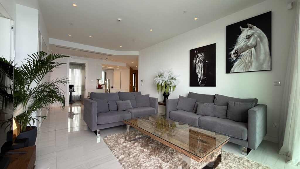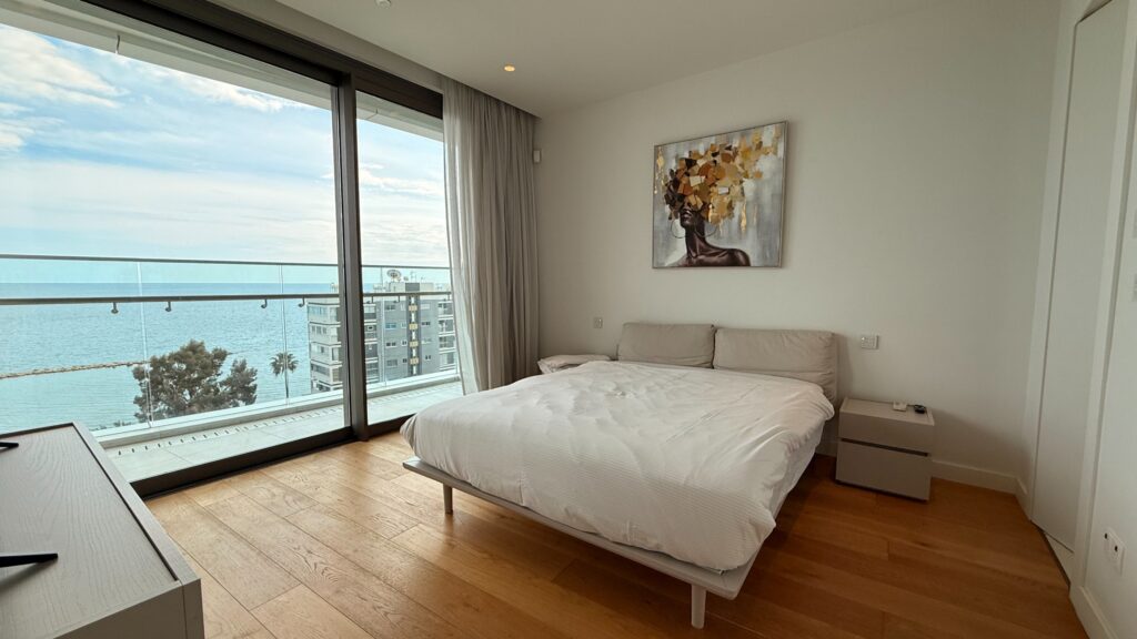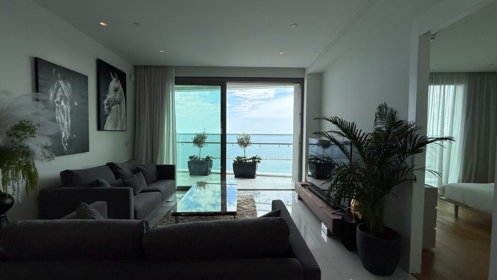 A luxury 2 BR + 1office apartment with a sea view is located in a private gated complex in the tourist area of Germasogeia, within walking distance of all amenities. Internal covered area 113.20 sq msq. m + covered veranda 16.23 sq. m. It consists of an open-plan kitchen with a dining and living area, two bedrooms (both en-suite), a separate office/guest room, and a guest WC. The apartment is fully furnished and equipped, with a central VRV air conditioning system, underfloor heating, smart house system, alarm system, parquet floor in bedrooms, double-glazed windows, intercom, solar panels for hot water, and uncovered parking. The complex has 24/7 security, concierge service, a gym with panoramic sea views, massage rooms, a SPA area, indoor/outdoor swimming pools, a sauna, and a lounge area for the residents.