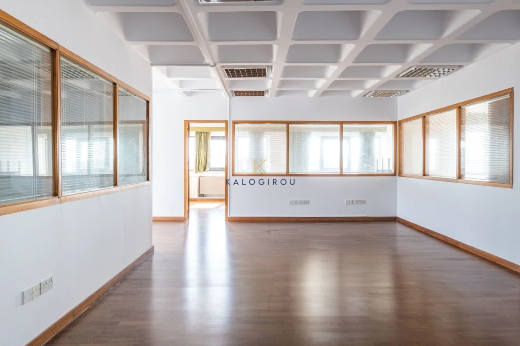 Office for rent in the prime area of Agioi Omologites, in Nicosia. The office is located on the sixth floor and occupies the entire floor. It consists of the reception area, open plan area, three rooms, conference room and storage room. The office has internal covered area of 238sqm. The building benefits of an exclusive right for 5 parking spaces. The office is part of a mixed – use building that consists of 15 shops and offices as well.