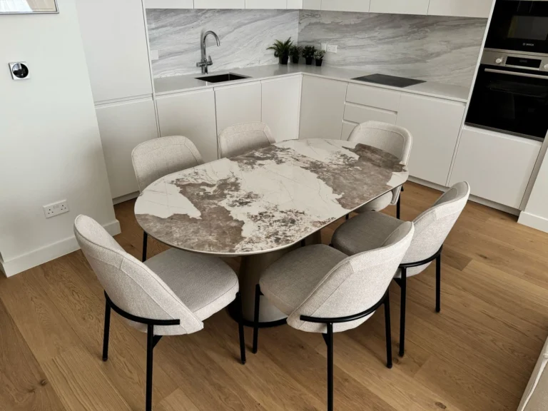 The units wrap around a formal garden in the centre and are set within generous landscaped grounds all around. The design is influenced by elements from both the natural and man-made world. Reminiscent of a superyacht, the superstructure of each block gently terraces down from its highest point with balconies on all sides. Wide horizontal bands form continuous balustrades that wrap around the blocks at each level, emphasizing the horizontal nature of the development which stretches to over 300 linear metres in length.
